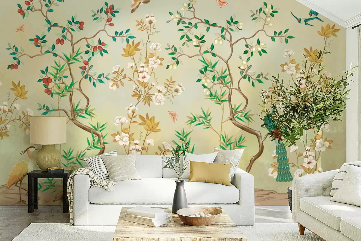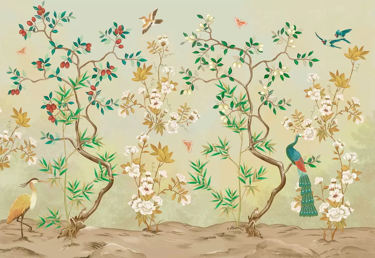 Papier peint photo Scène avec des arbres, des fleurs et des oiseaux, fond clair N° w05004v1