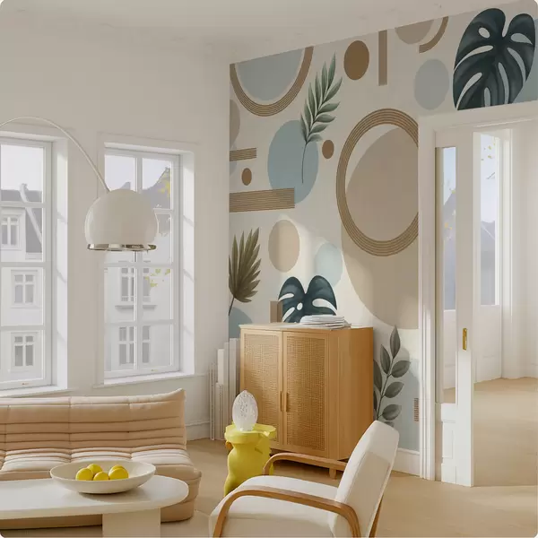 Papier peint photo Motif géométrique avec des feuilles et des cercles dans des tons apaisants N° w05018
