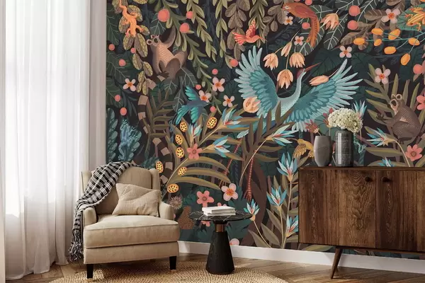 Papier peint photo Scène fantastique avec des oiseaux et des animaux parmi les plantes N° w05024