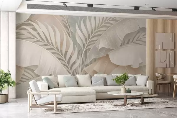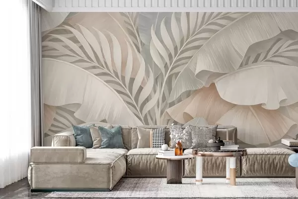 Papier peint photo grandes feuilles tropicales dans les tons pêche et turquoise mat N° w05062