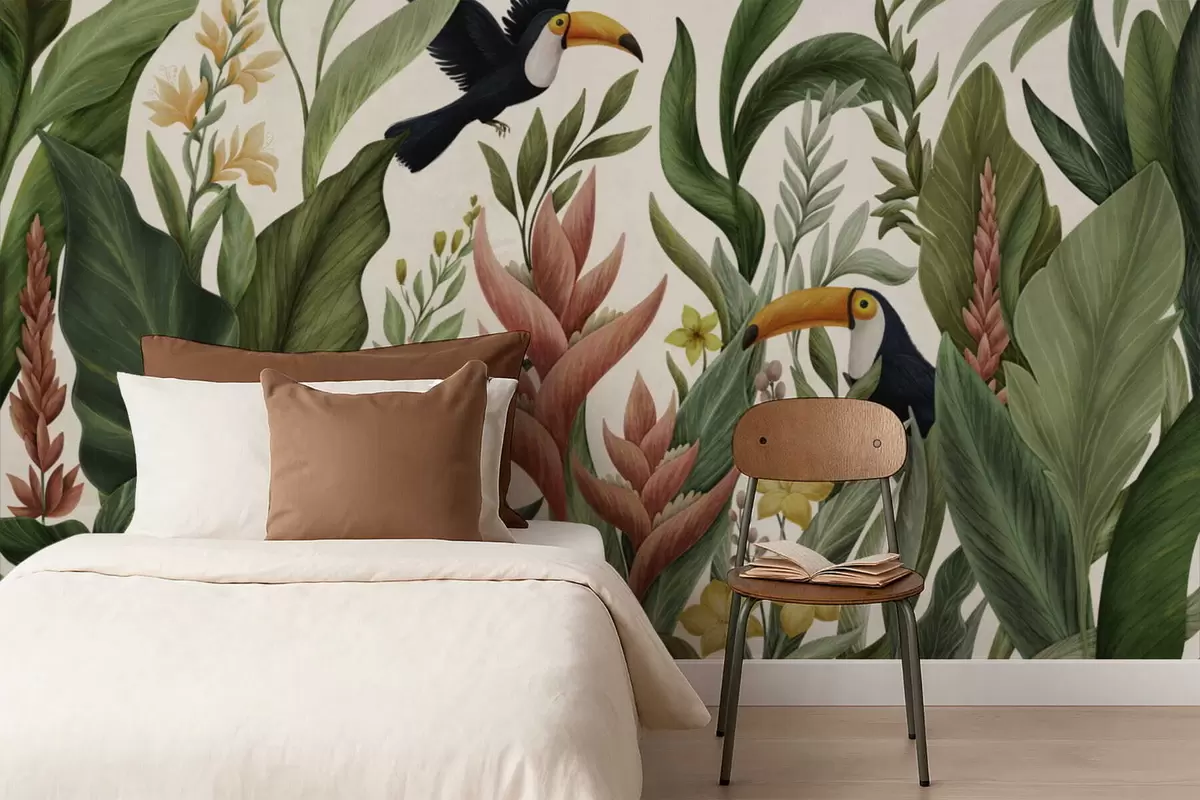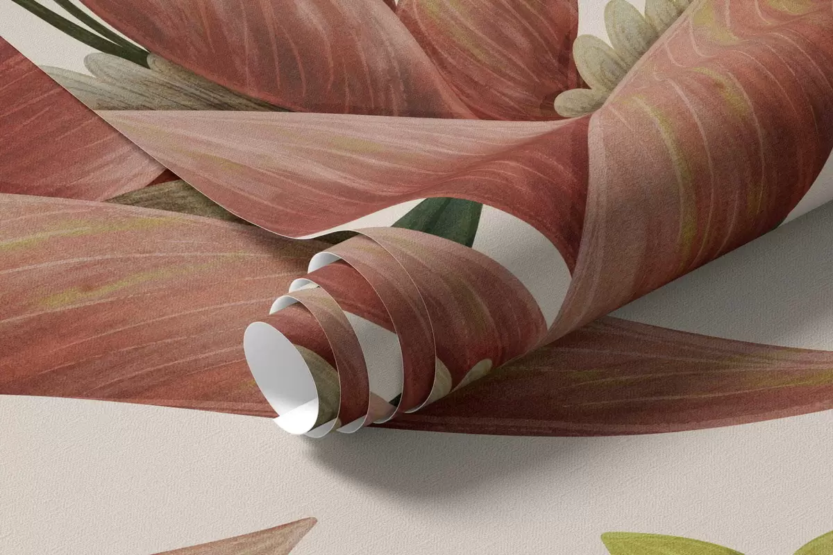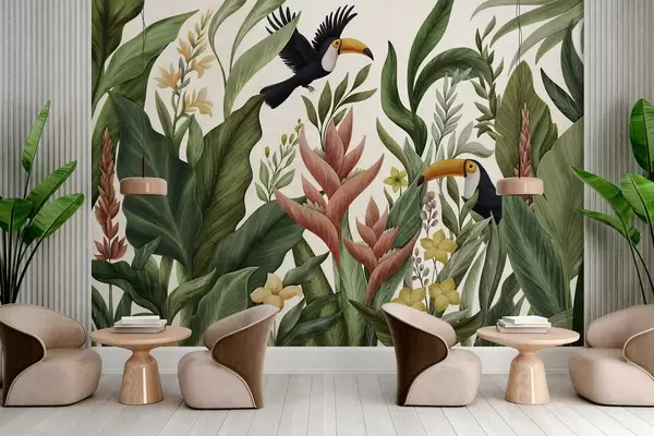 Papier peint photo Plantes tropicales et oiseaux à long bec sur fond clair N° w05088v1