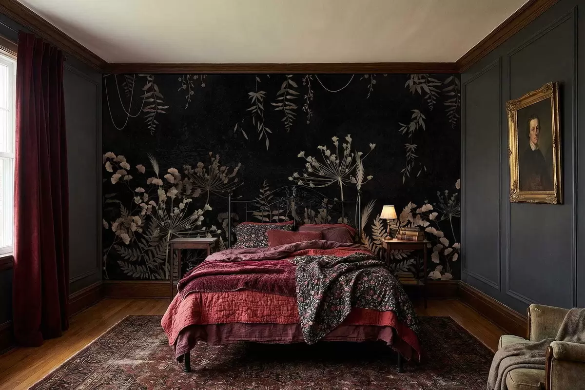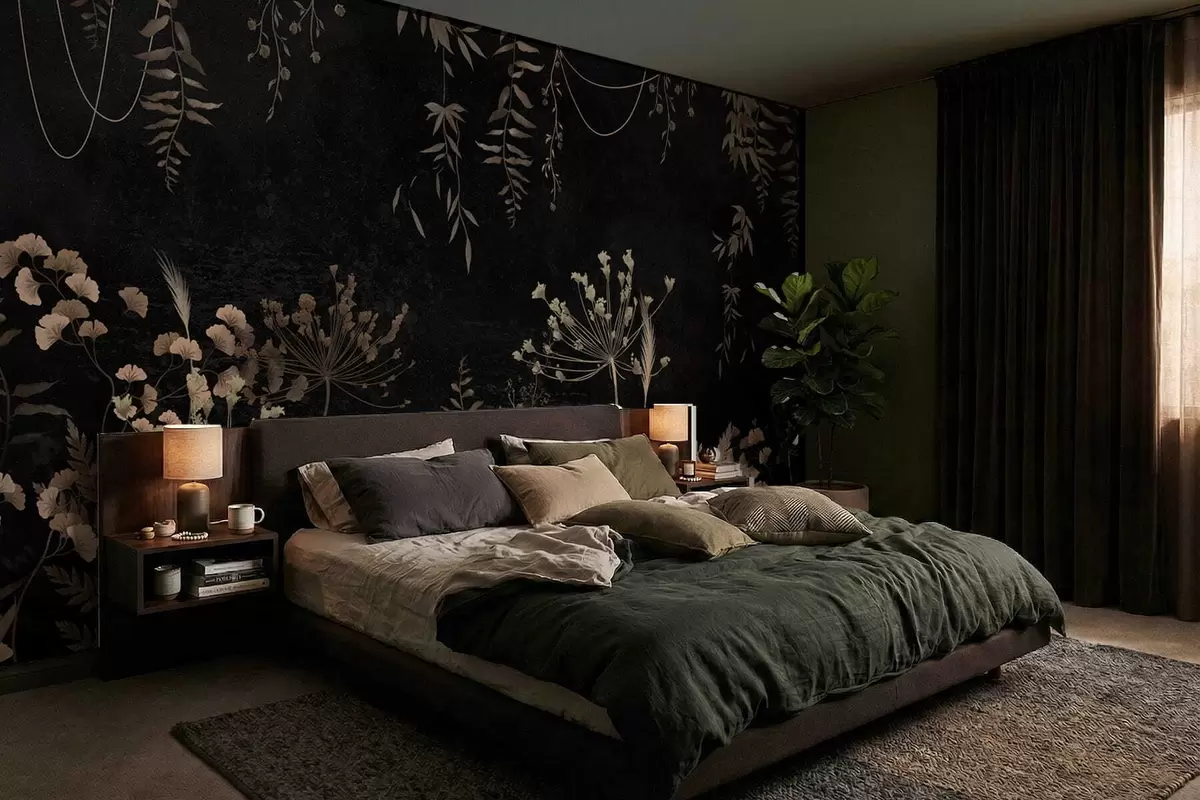 Papier peint photo Motif botanique sombre avec des fleurs et des feuilles N° w05092