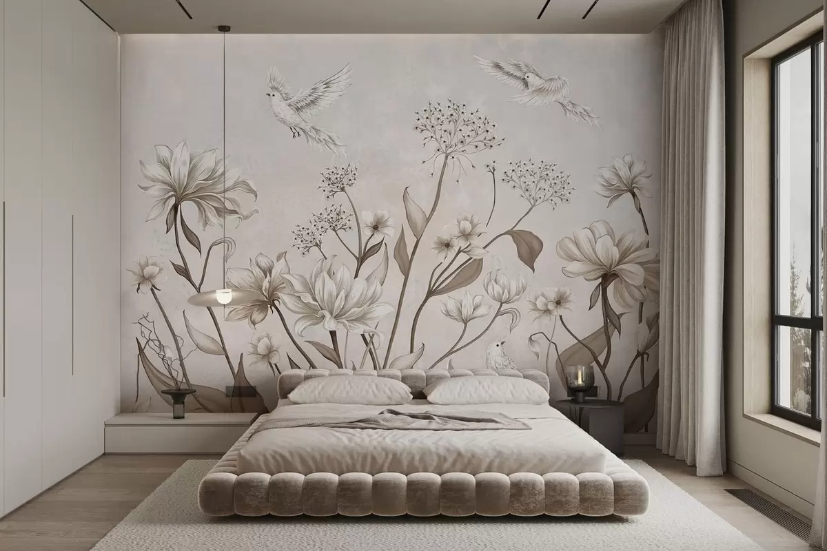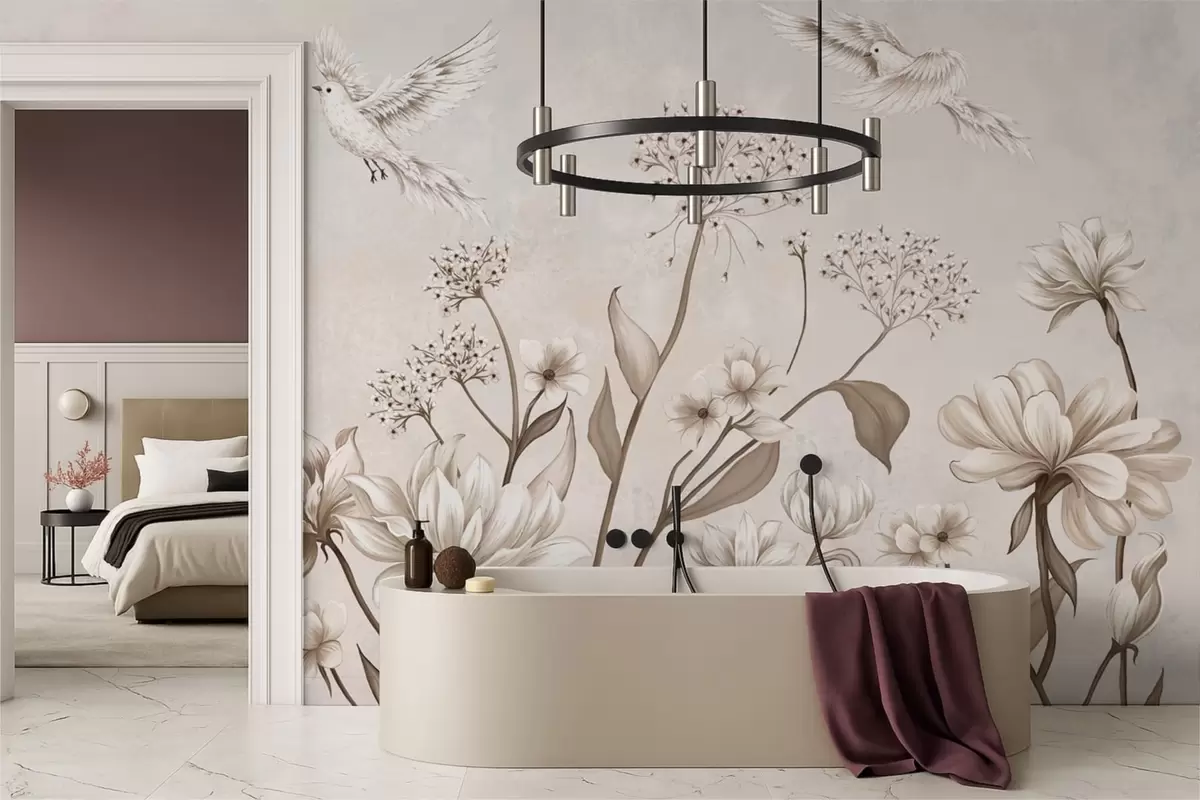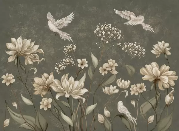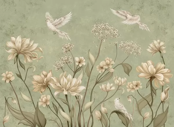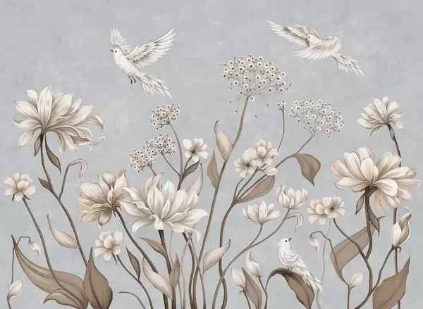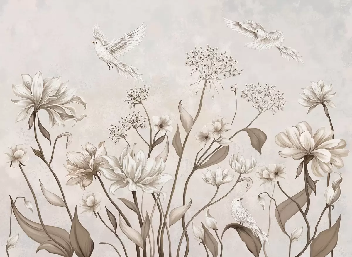Papier peint photo Des fleurs et des oiseaux délicats sur un fond doux N° w05118