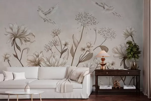 Papier peint photo Des fleurs et des oiseaux délicats sur un fond doux N° w05118