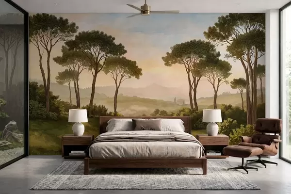 Papier peint photo Paysage avec des arbres baignés dans la lumière chaude du coucher de soleil N° w05122
