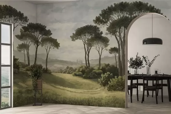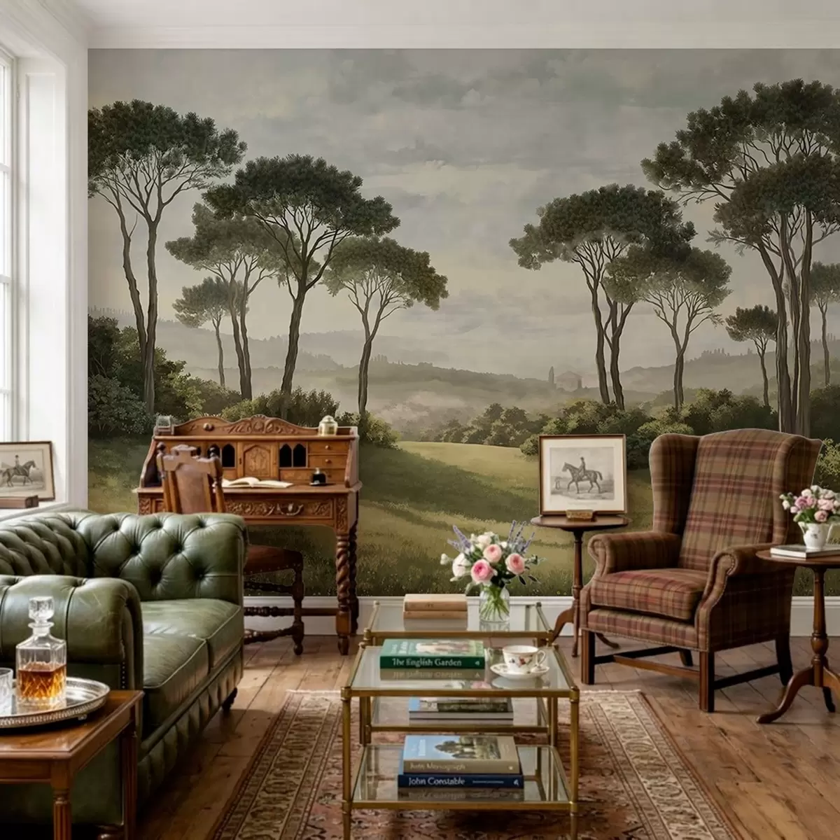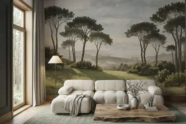 Papier peint photo Paysage avec des arbres, une prairie et de la brume au loin N° w05122v1