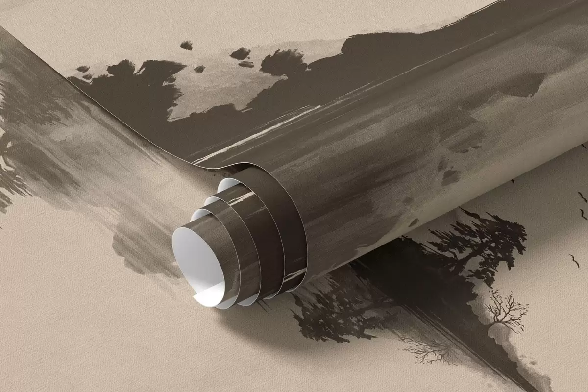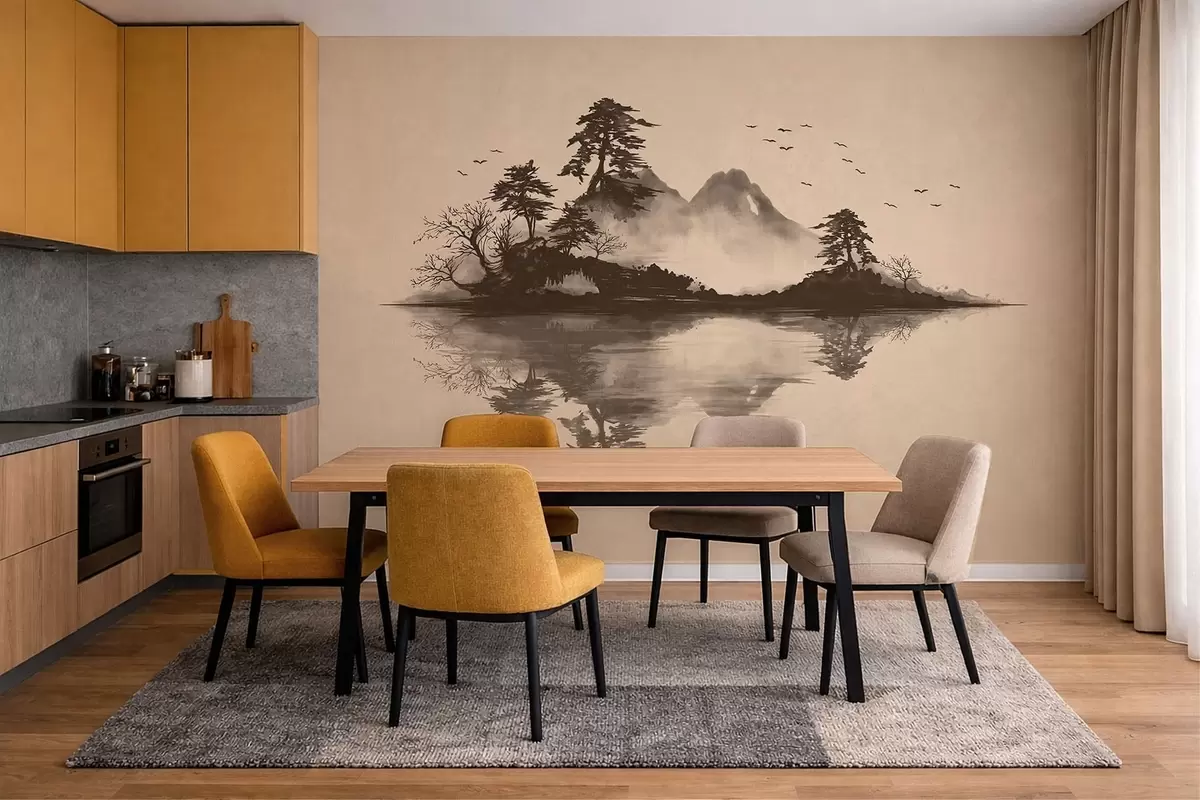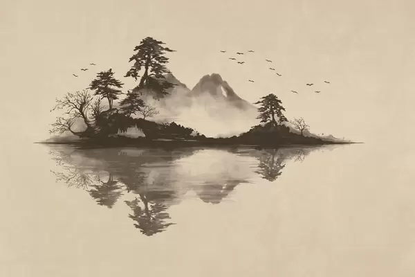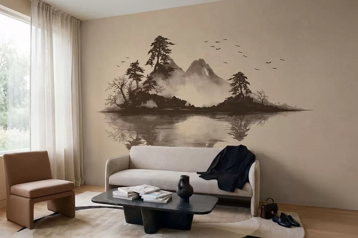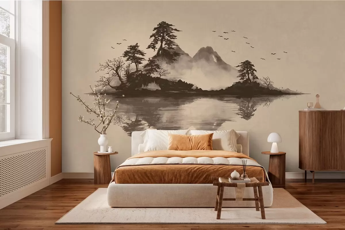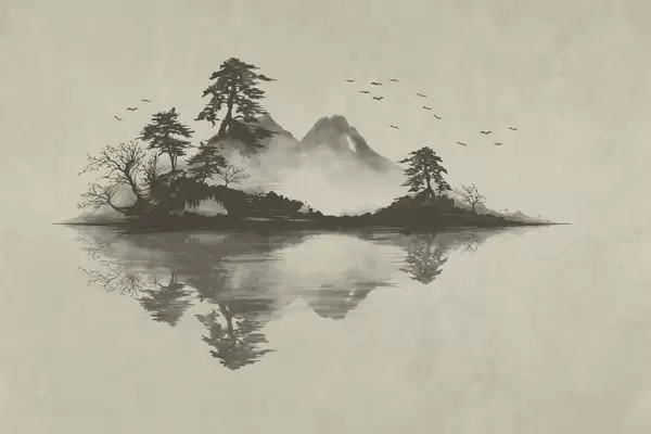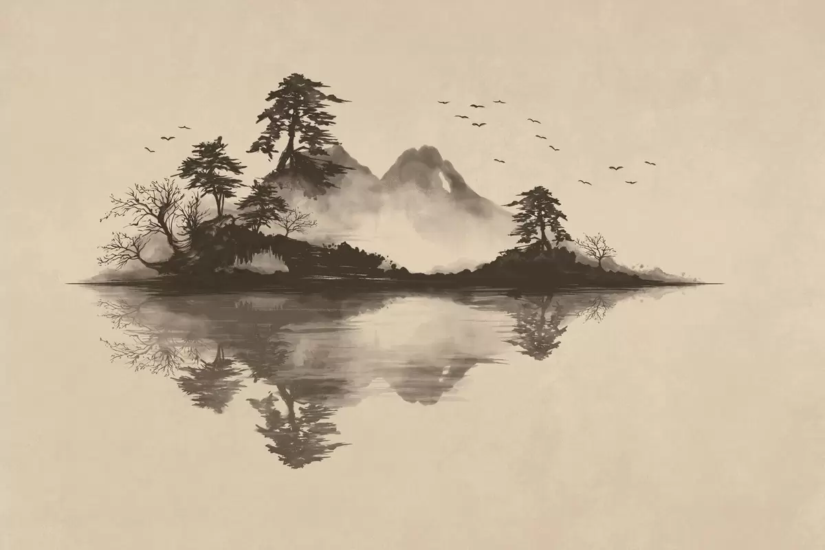 Papier peint photo Paysage de montagne au sumi-e avec des pins et un reflet N° w05124