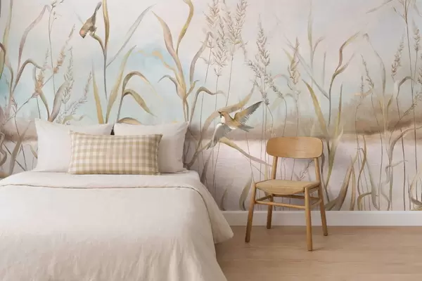 Papier peint photo Illustration de roseaux et d'oiseaux au bord de l'eau dans des tons doux N° w05125