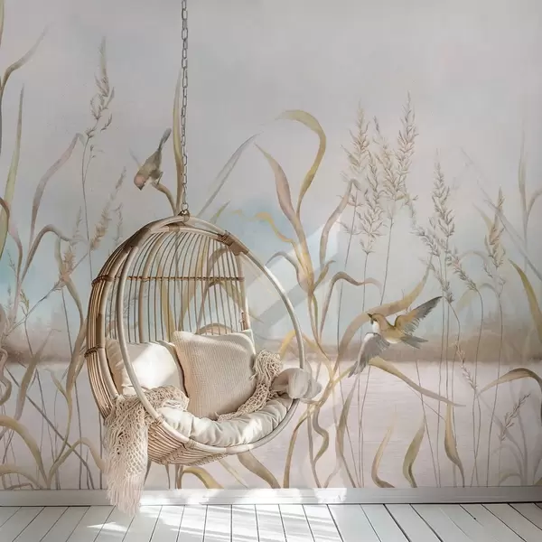 Papier peint photo Illustration de roseaux et d'oiseaux au bord de l'eau dans des tons doux N° w05125