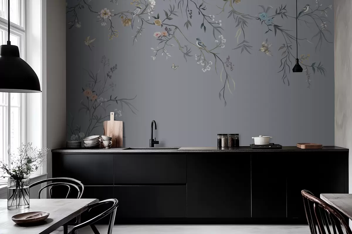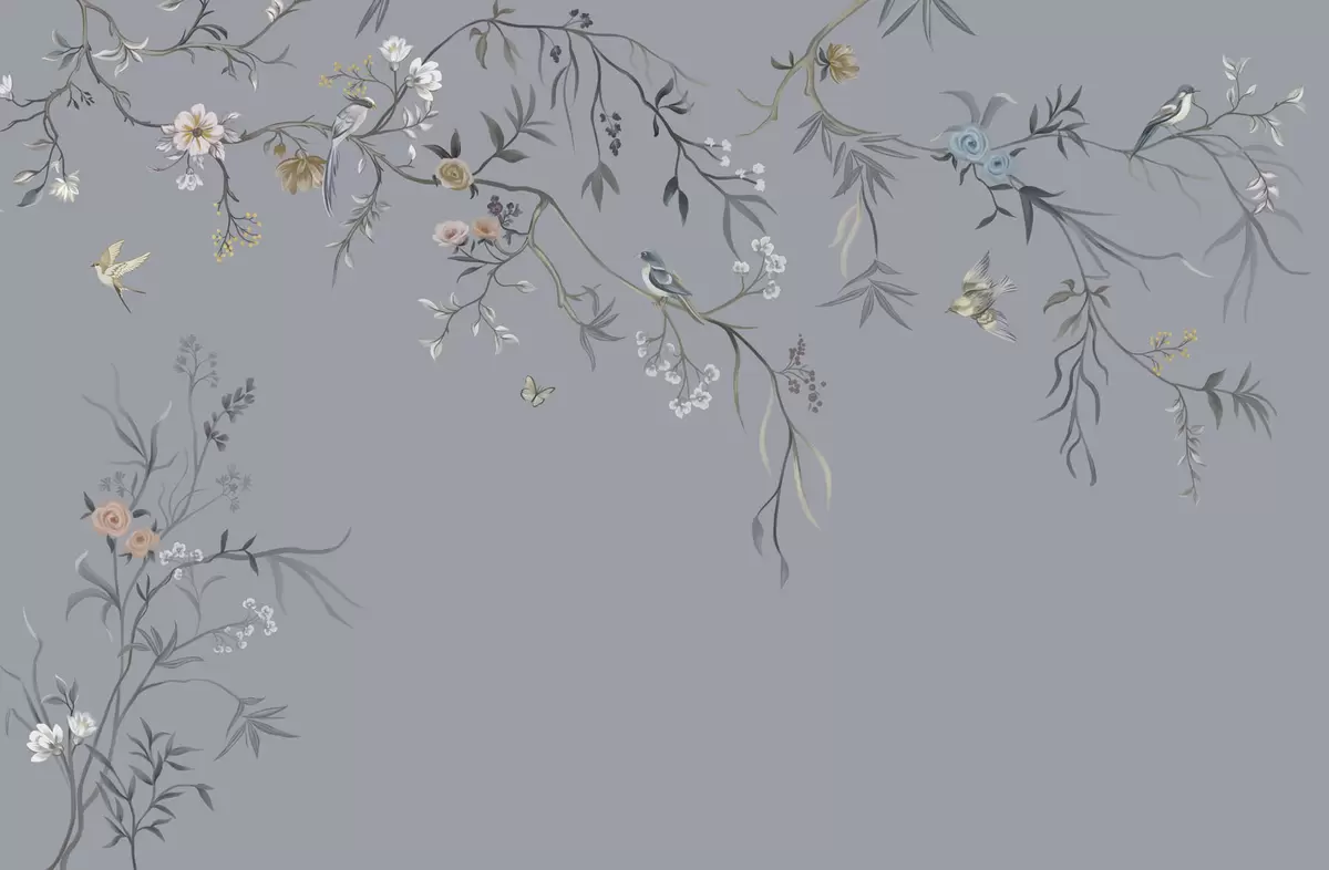 Papier peint photo Branches fleuries avec des oiseaux sur fond verdâtre N° w05127v5