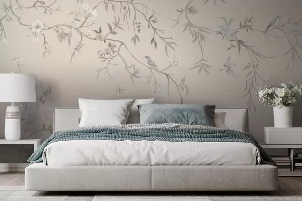 Papier peint photo Branches fleuries avec des oiseaux sur fond clair N° w05127v7