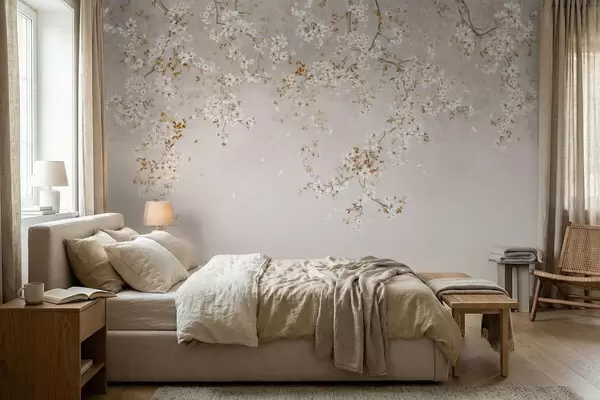Papier peint photo Branches avec des fleurs blanches sur un fond beige clair N° w05129