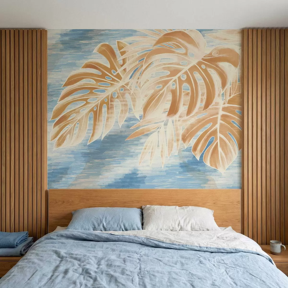 Papier peint photo Feuilles dans des tons sable clairs sur fond bleu N° w05130v1