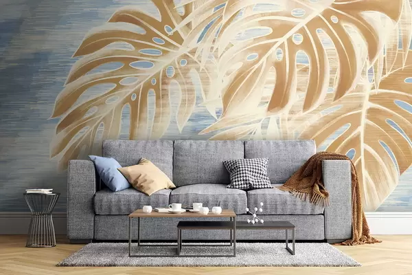 Papier peint photo Feuilles dans des tons sable clairs sur fond bleu N° w05130v1