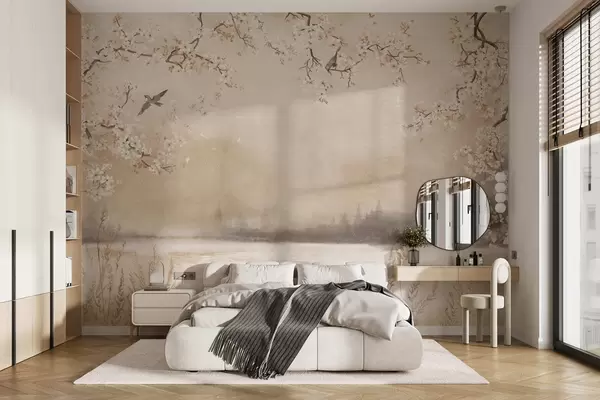 Papier peint photo Branches délicatement fleuries au bord d'un lac avec des oiseaux dans une légère brume N° w05155