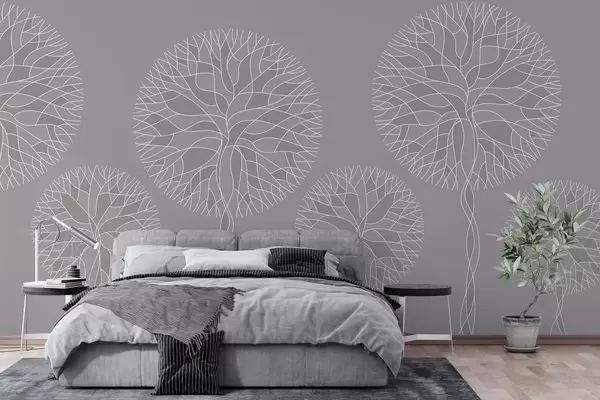 Papier peint photo Arbres fantaisistes linéaires aux couronnes luxuriantes dans des tons gris moyens N° w05213v5