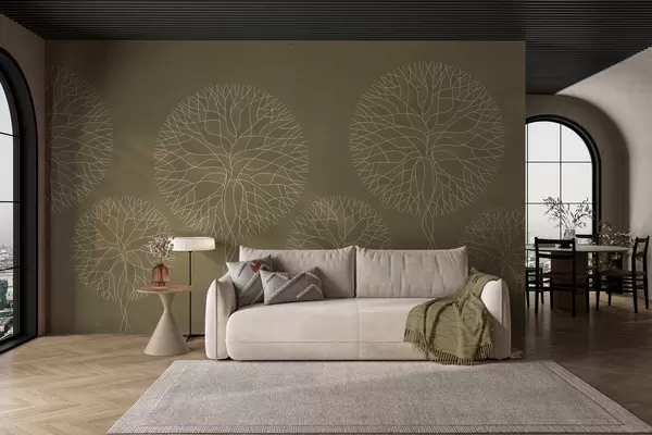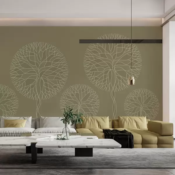 Papier peint photo Arbres fantaisistes linéaires aux couronnes luxuriantes dans des tons kaki N° w05213v7