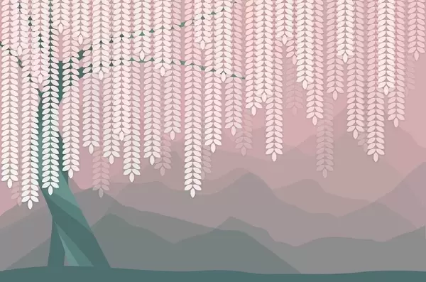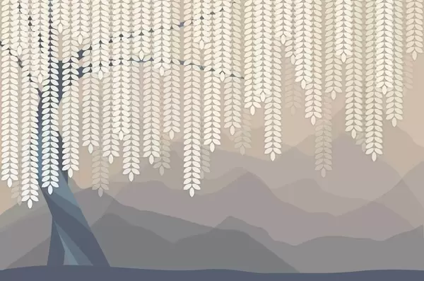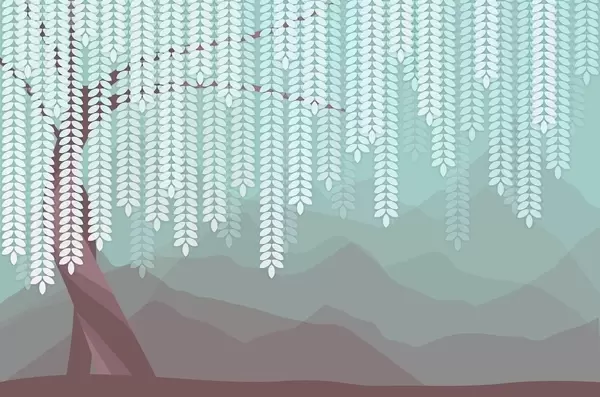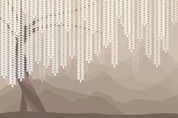 Papier peint photo Saule stylisé aux feuilles pendantes sur fond de montagnes minimalistes dans des tons beige et bleu-vert. N° w05232
