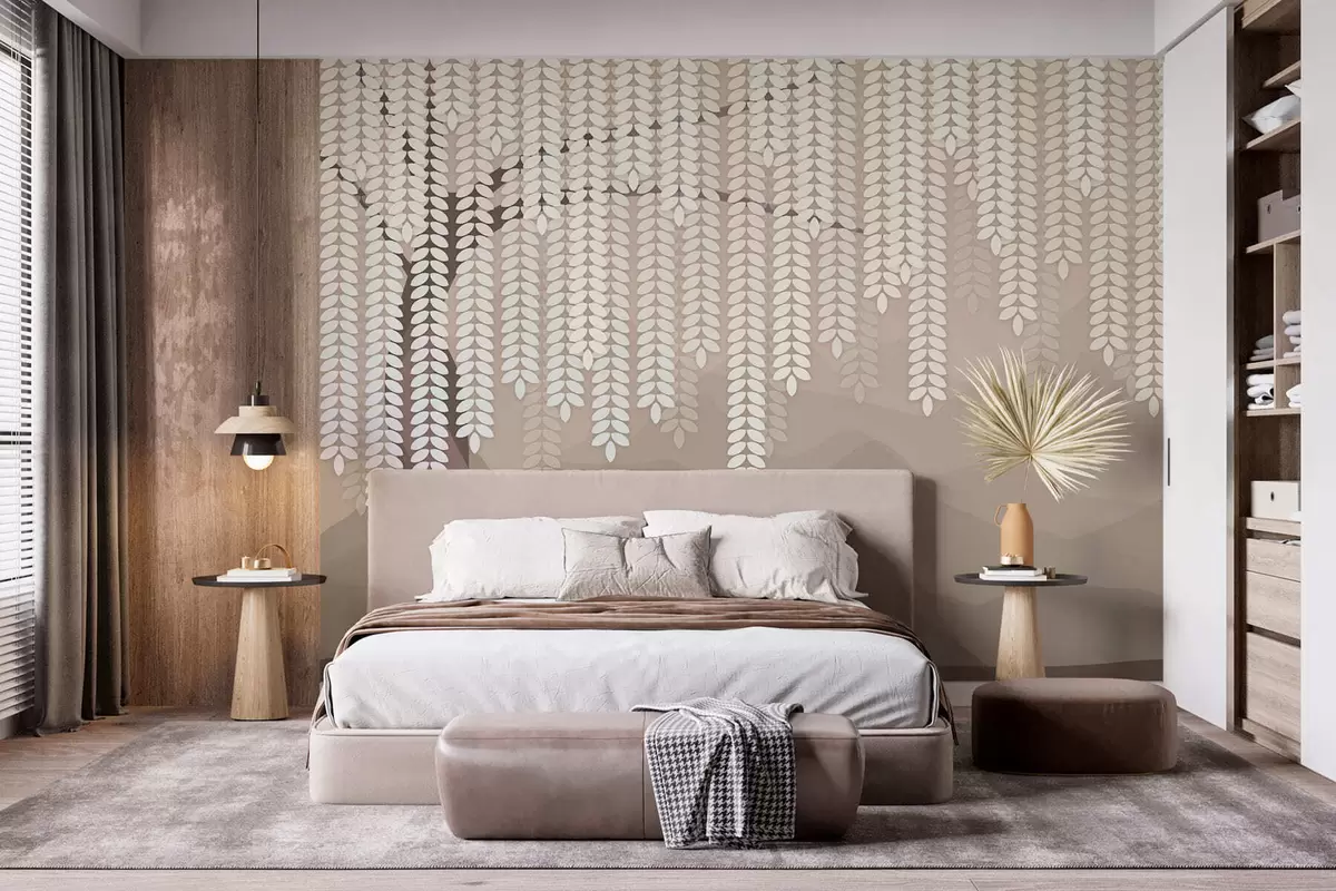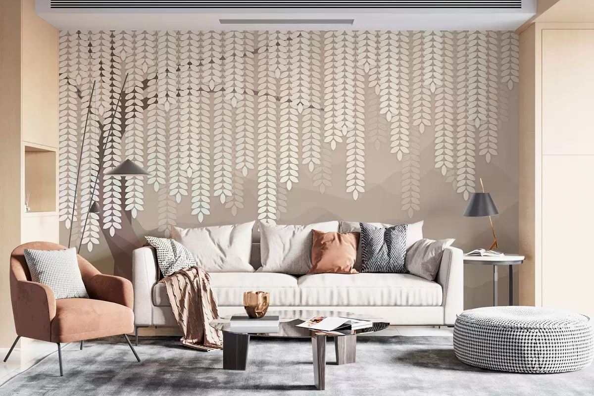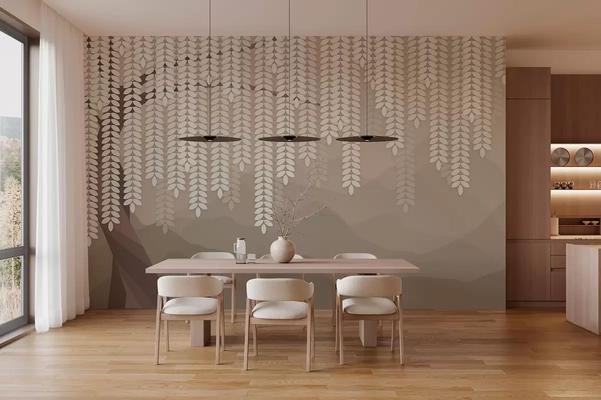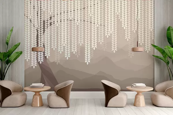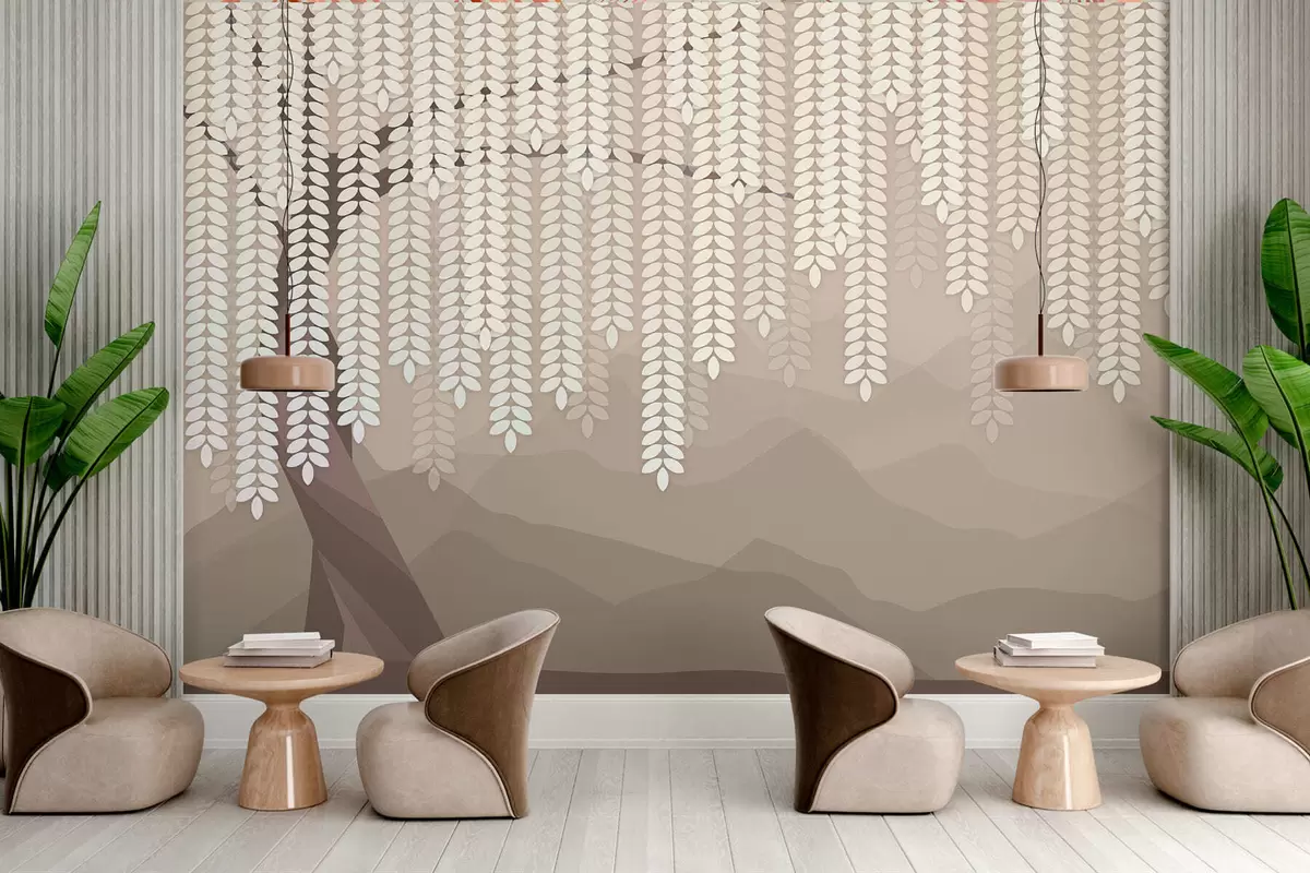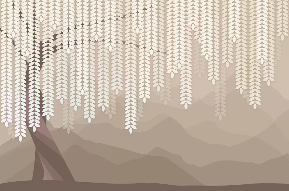 Papier peint photo Saule stylisé avec des feuilles pendantes sur fond de montagnes minimalistes dans des tons café. N° w05232v2
