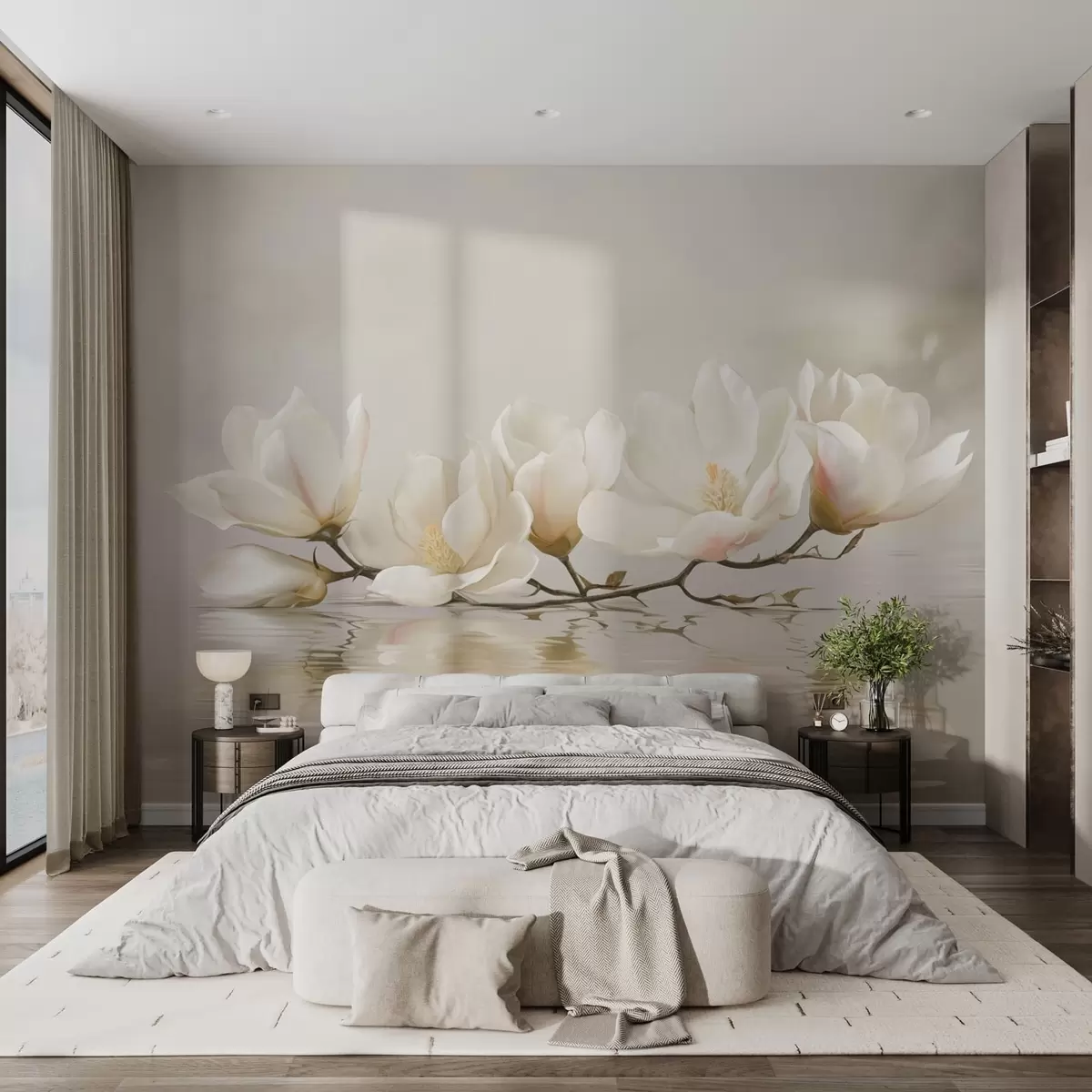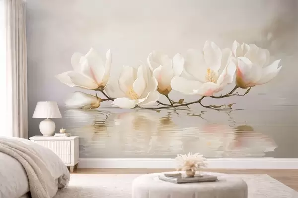 Papier peint photo Fleurs de magnolia claires sur une branche au-dessus du reflet de l'eau N° w05353