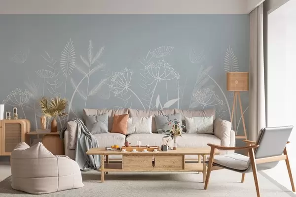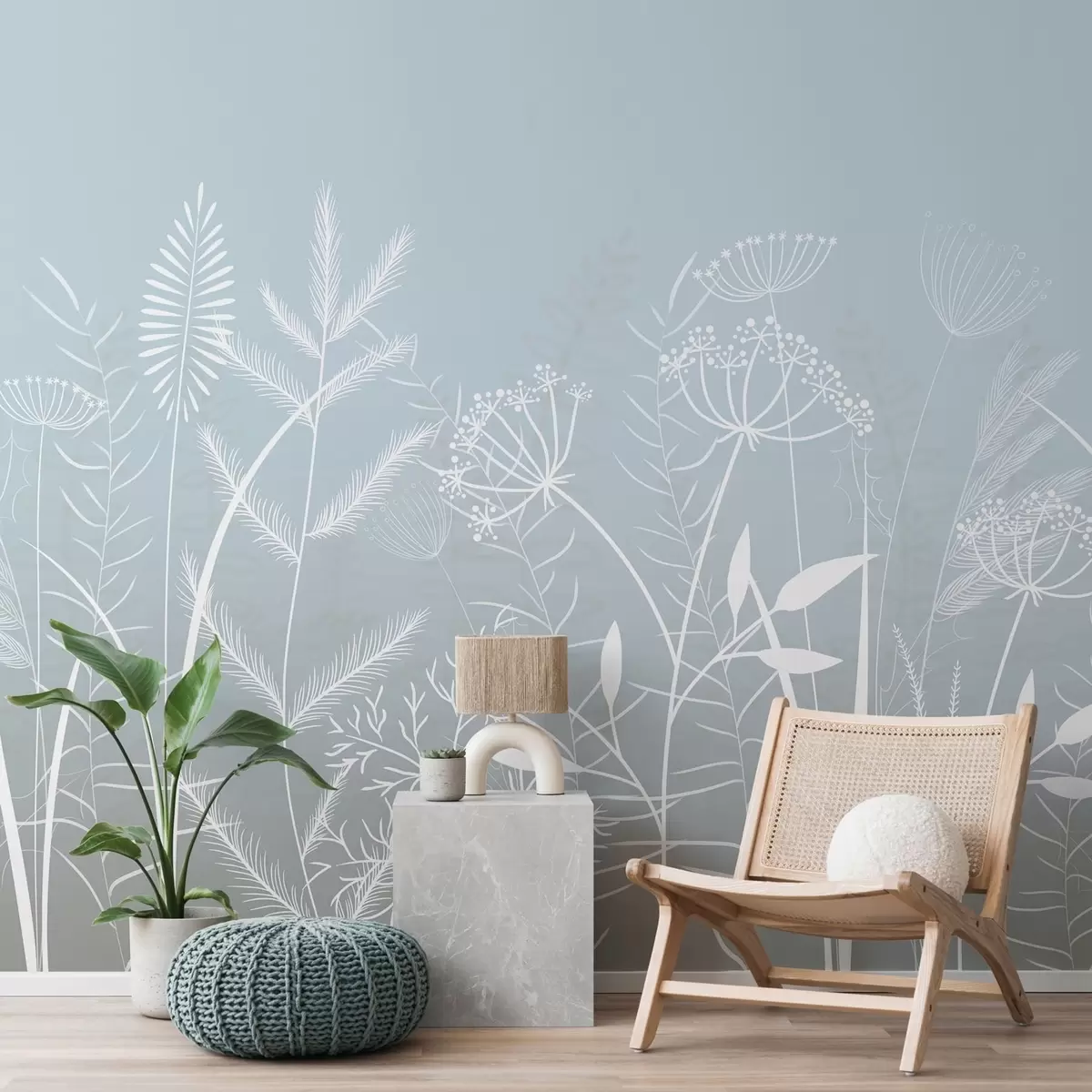 Papier peint photo des herbes sauvages et des fleurs délicatement peintes à la main sur un fond gris-bleu N° w05383