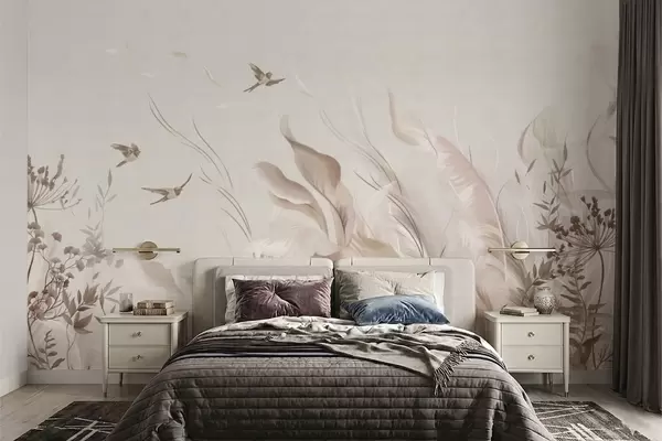 Papier peint photo Des plumes douces, des herbes et des oiseaux dans des tons clairs N° w05395