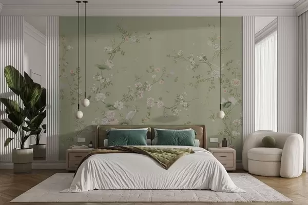 Papier peint photo Branches fleuries avec des oiseaux sur fond vert clair N° w05416