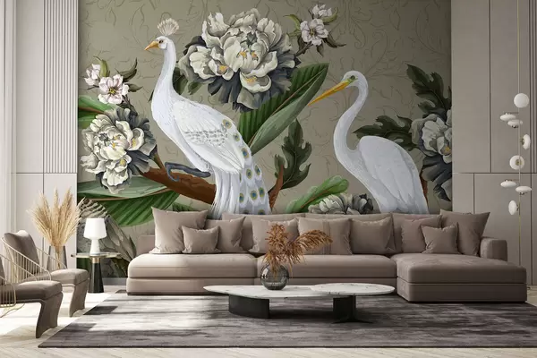 Papier peint photo Une paire de paons blancs avec de longues queues entourées de grandes fleurs de pivoines blanches et d'un feuillage vert luxuriant N° w07975