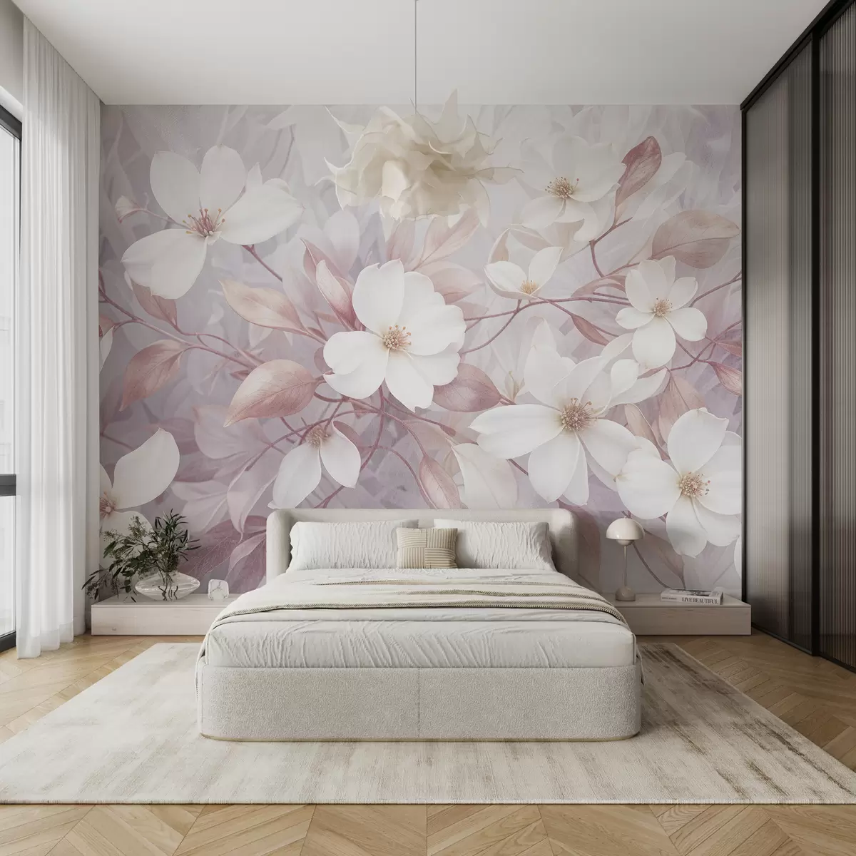 Papier peint photo De délicates fleurs de magnolia roses et blanches fleurissent sur des branches douces et floues sur un fond pâle N° w08196