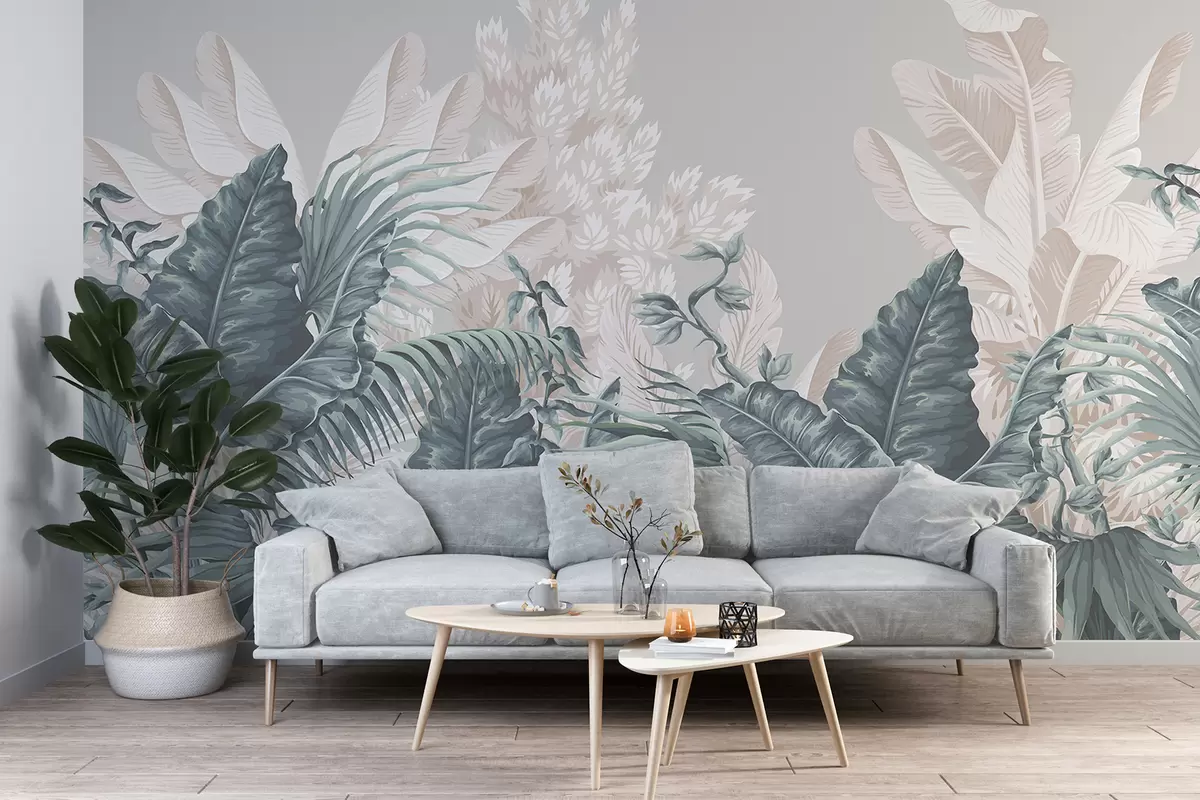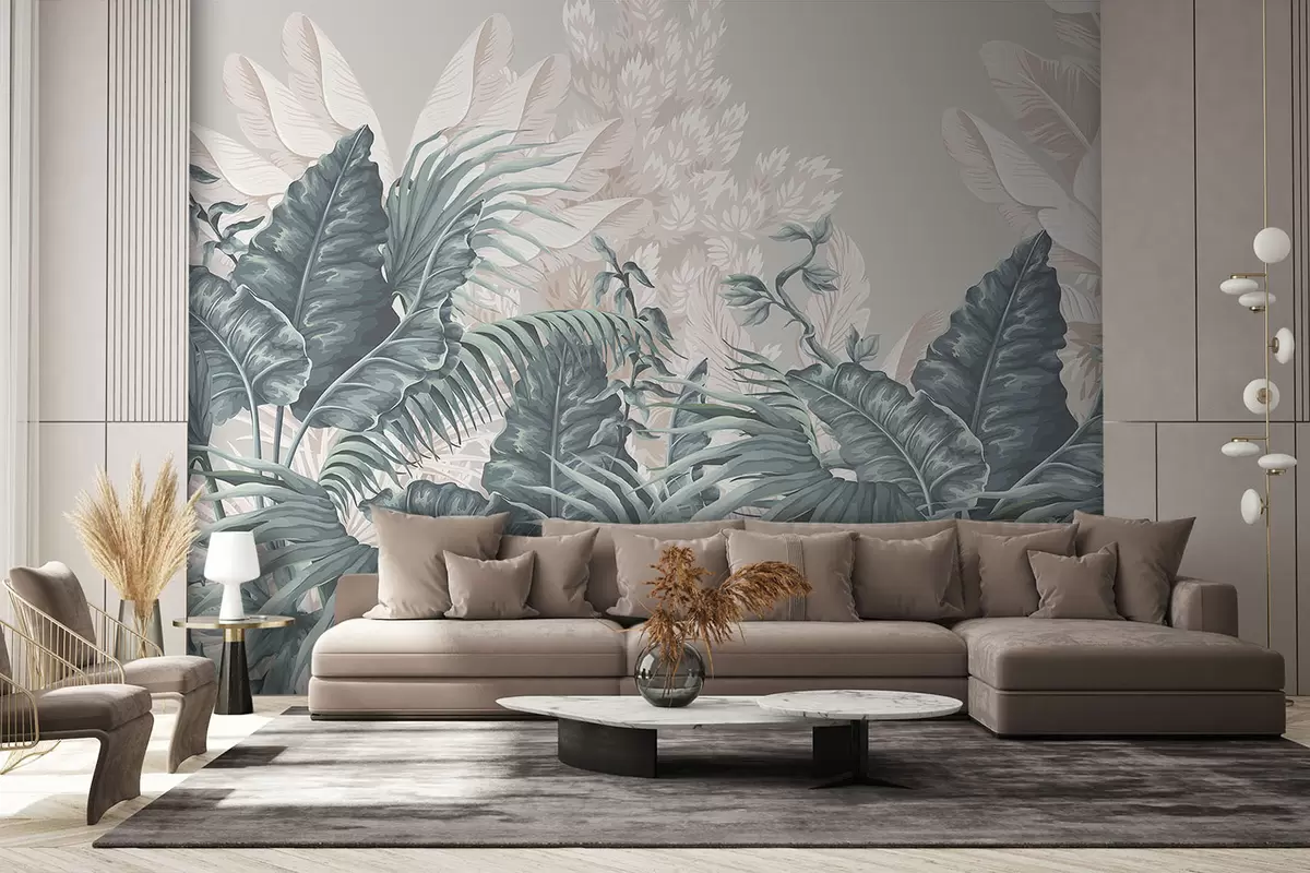 Papier peint photo Une scène de jungle tropicale avec de grandes feuilles vertes et des fleurs au premier plan, créant une atmosphère luxuriante N° w08242