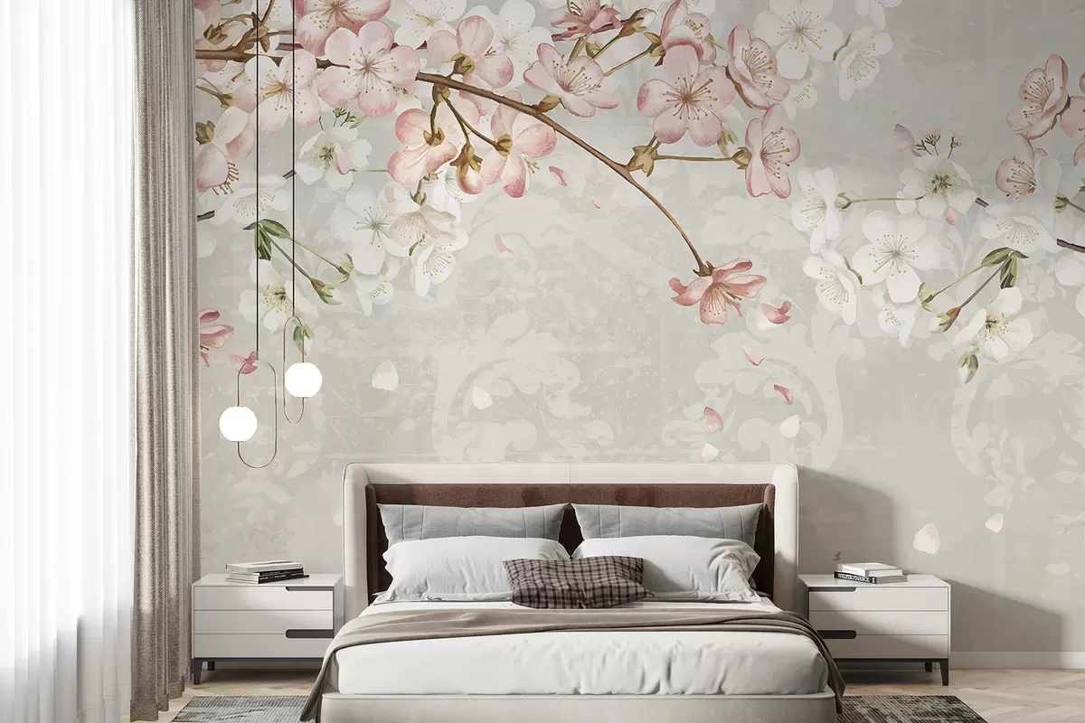 Papier peint photo Fleurs de cerisier roses et blanches en pleine floraison, avec des pétales doux tombant sur un fond beige texturé N° w08254v1