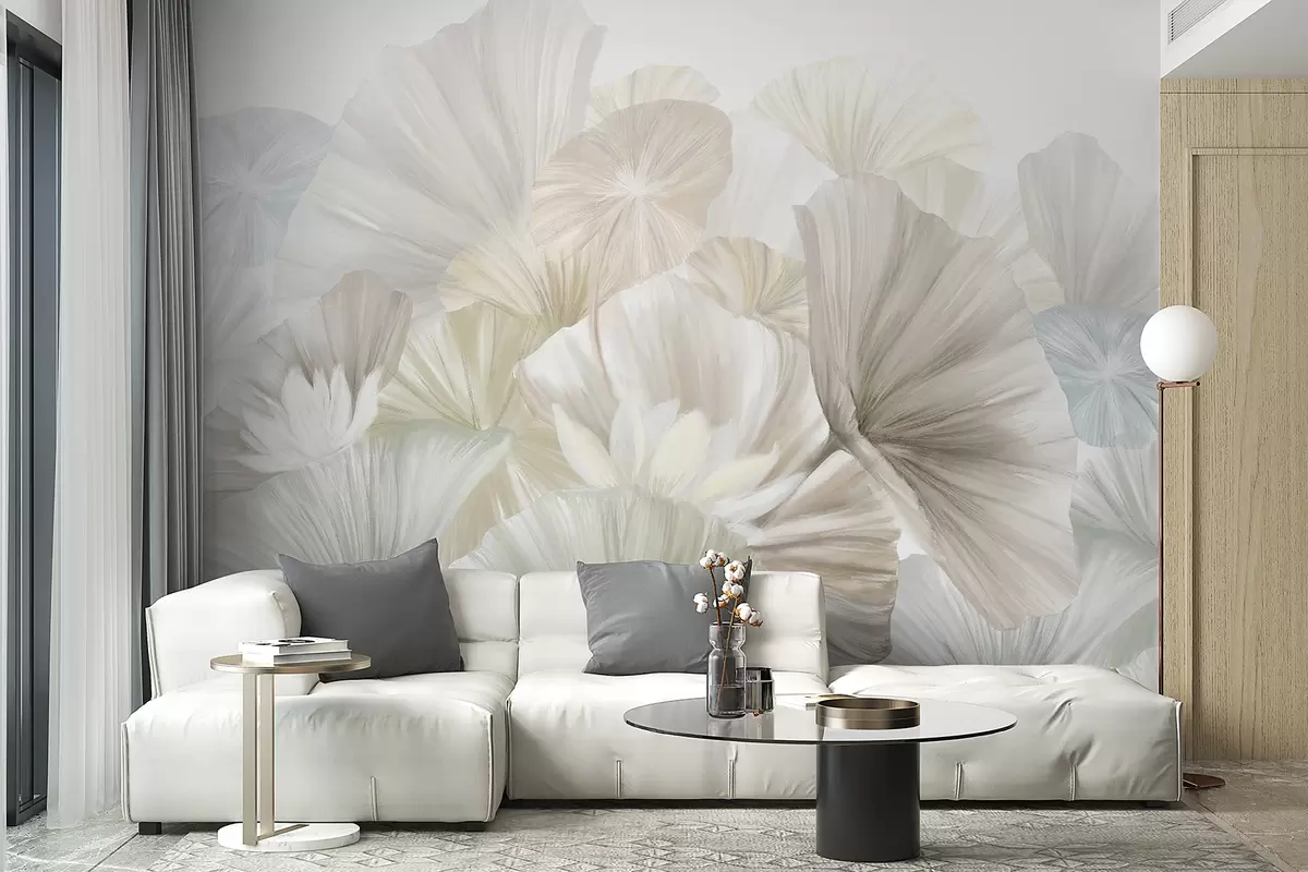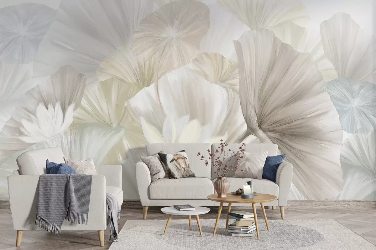 Papier peint photo Délicates feuilles de lotus vertes avec des fleurs blanches aux pétales doux et plumeux disposées dans une composition artistique naturelle N° w08265