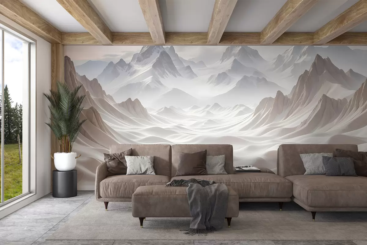 Papier peint photo Pics montagneux enneigés émergeant d'un paysage brumeux et éthéré de collines et de vallées ondulantes N° w08313