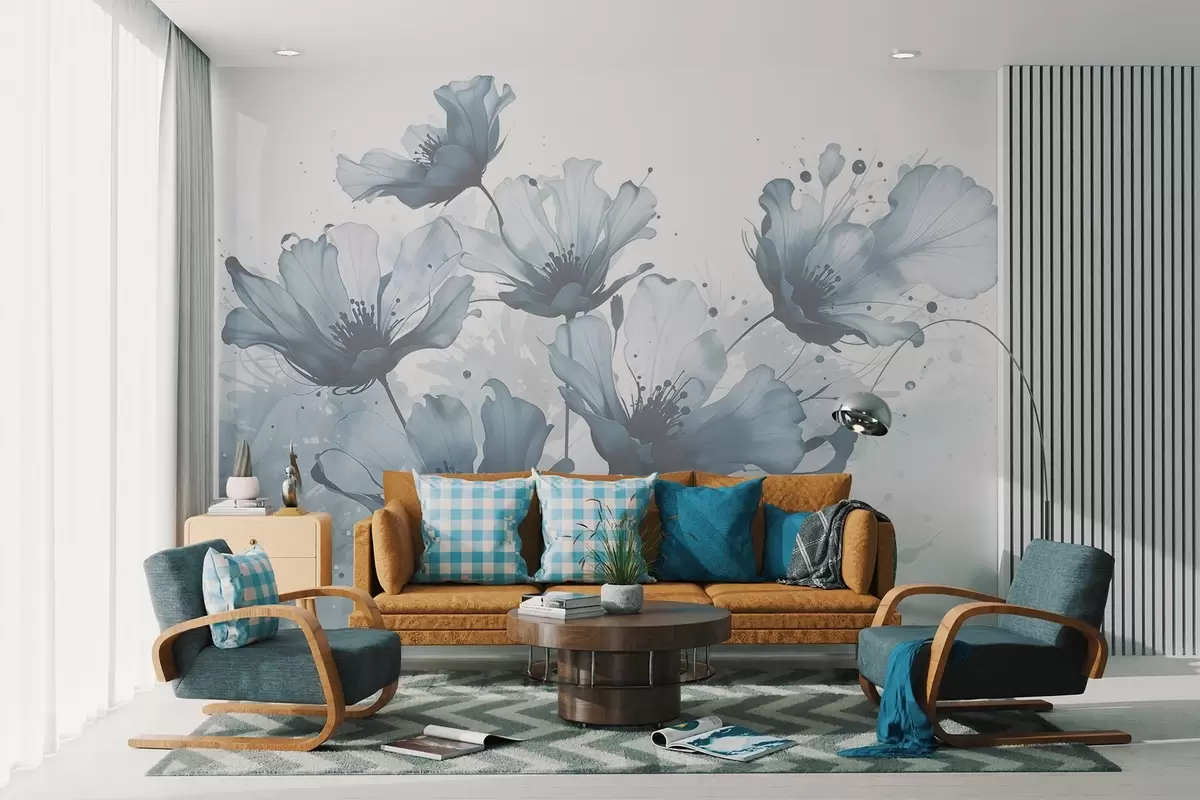 Papier peint photo Fleurs bleues délicates avec des pétales doux et flous et des éclaboussures d'aquarelle sur un fond clair N° w08376