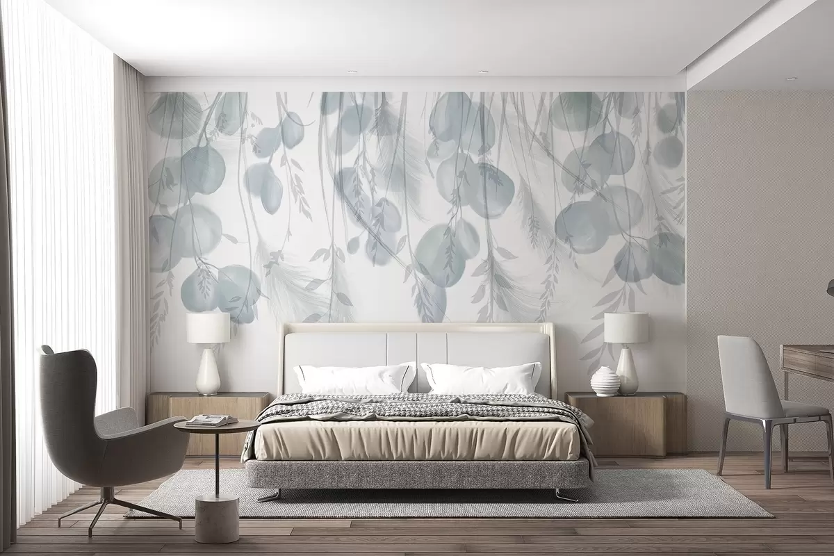 Papier peint photo De délicates feuilles d'eucalyptus grises et vertes pastel tombent, créant une atmosphère sereine et apaisante N° w08380