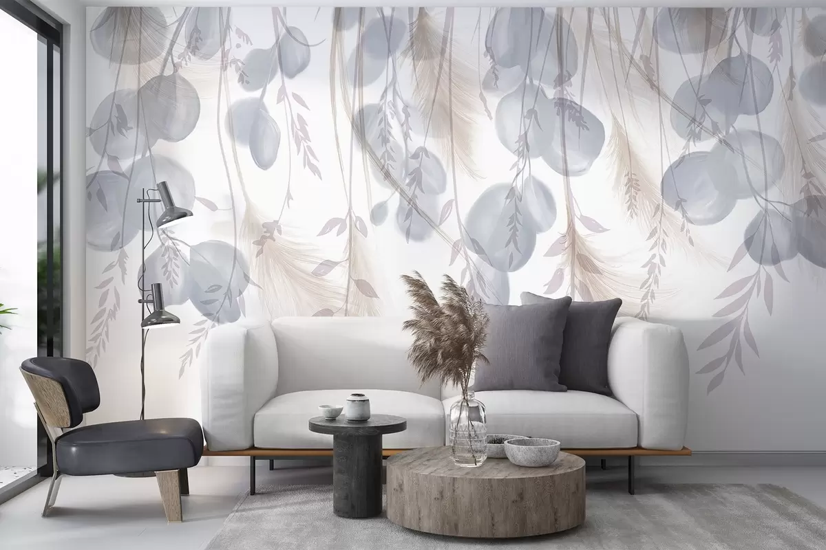 Papier peint photo De délicates feuilles d'eucalyptus bleues et beige pastel tombent, créant une atmosphère sereine et apaisante N° w08380v1