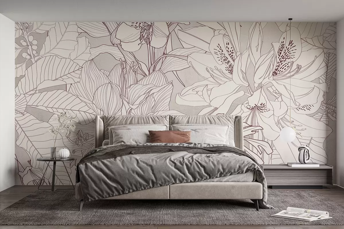 Papier peint photo Imprimé floral bordo et gris détaillé avec différents types de fleurs et de feuilles, un motif botanique luxuriant et complexe N° w08385