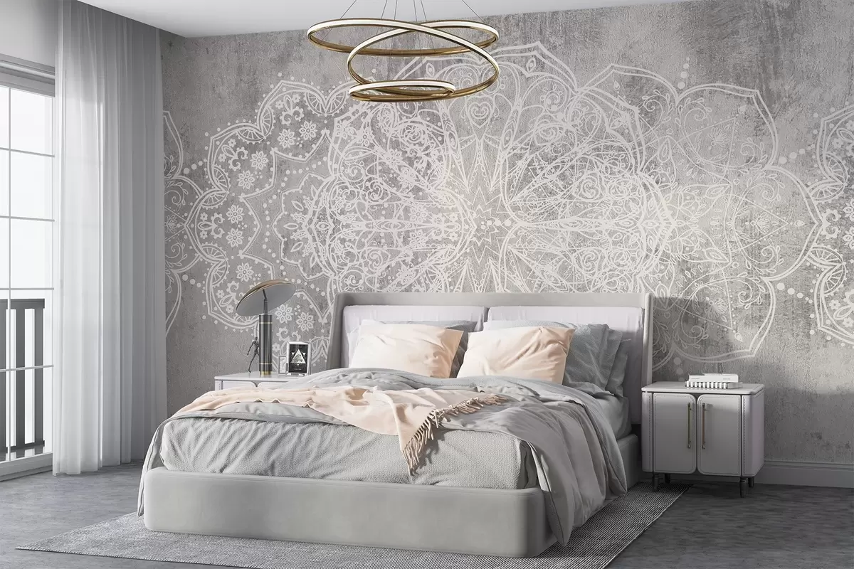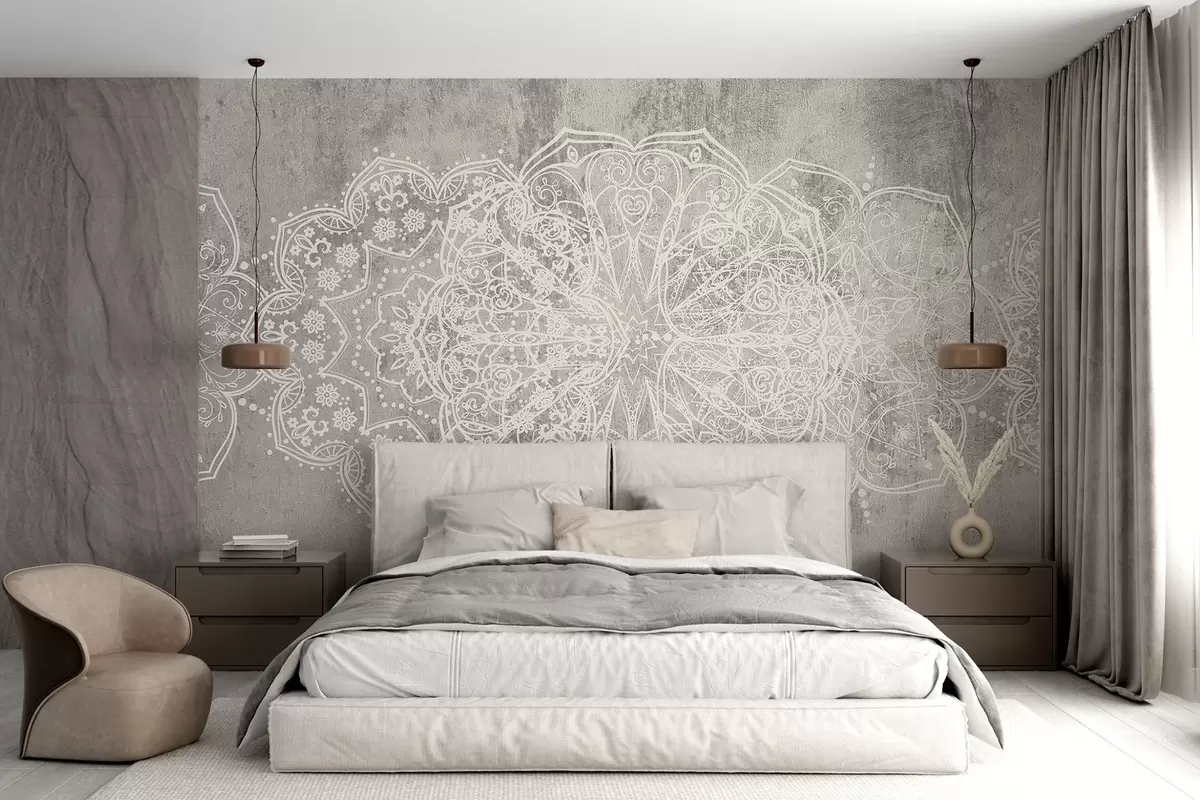 Papier peint photo Un motif de mandala en dentelle blanche, détaillé et complexe, sur un fond de mur gris loft texturé N° w08387
