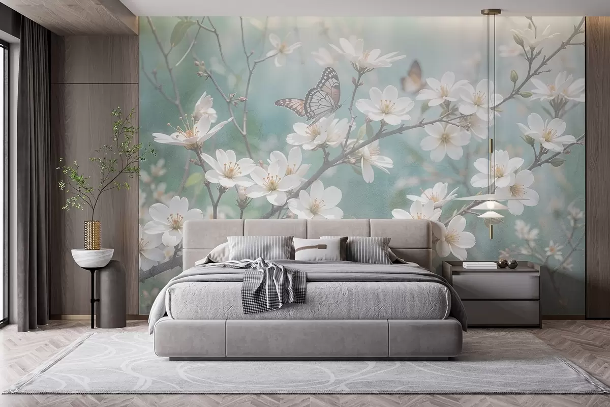 Papier peint photo Papillon blanc sur une branche avec de délicates fleurs de cerisier blanches au premier plan sur un arrière-plan flou N° w08421