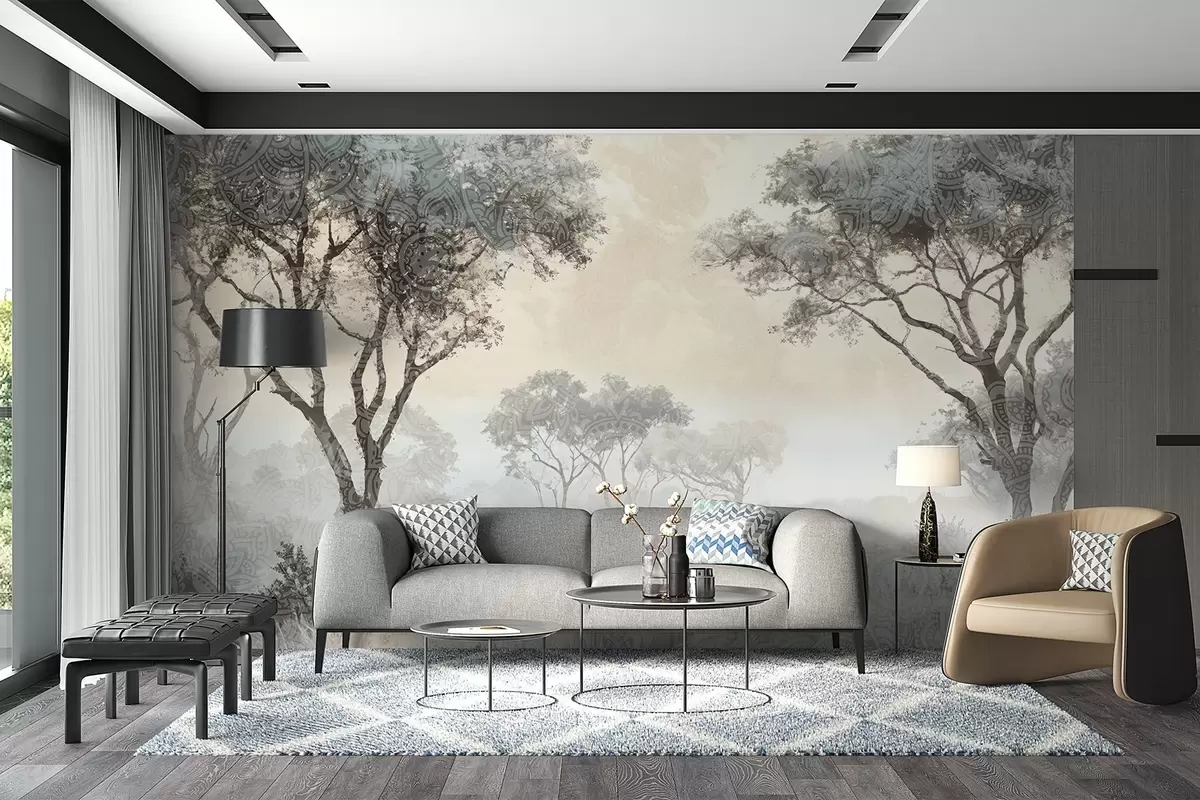 Papier peint photo Paysage brumeux et serein avec des silhouettes d'arbres au premier plan et un brouillard doux dans les tons gris et beige N° w08442v1