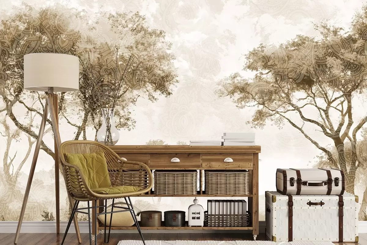 Papier peint photo Un paysage brumeux et serein avec des silhouettes d'arbres au premier plan et un brouillard doux dans les tons bruns et beiges N° w08442v2