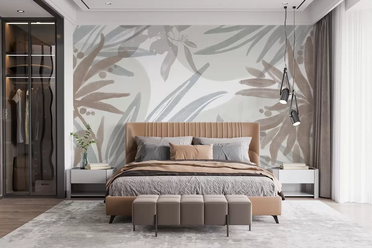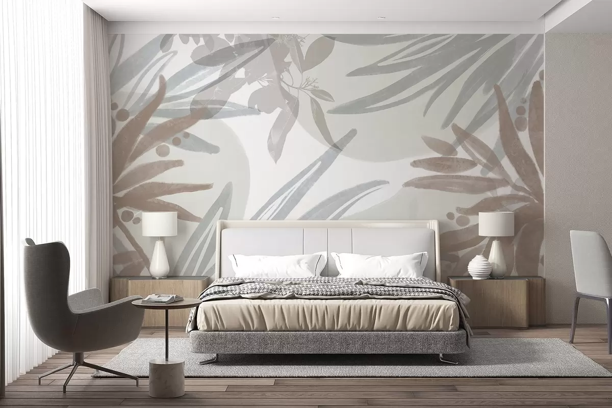 Papier peint photo Un motif floral abstrait aux tons neutres avec des feuilles et des formes qui se chevauchent dans des tons gris, blancs et beiges N° w08464