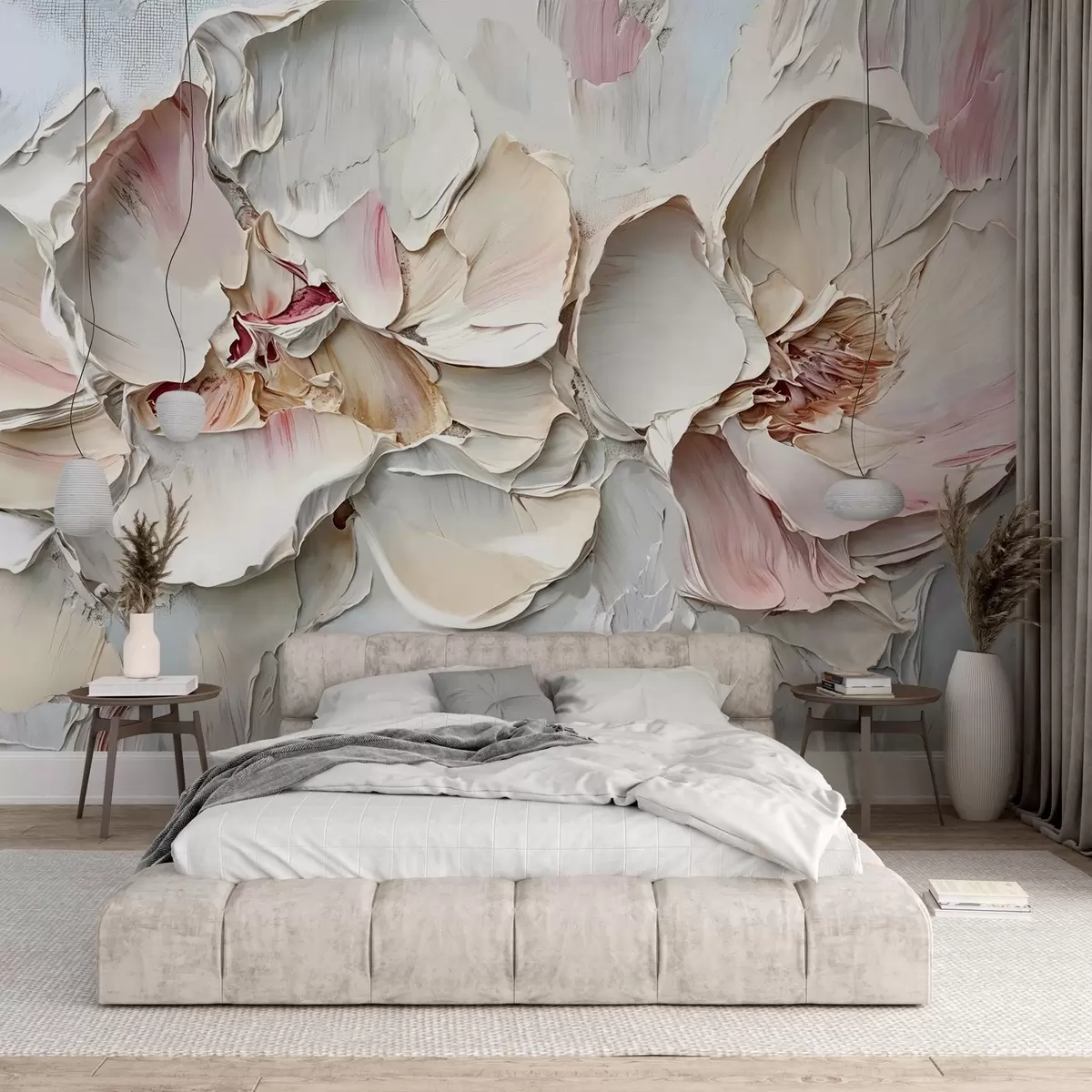 Papier peint photo Délicates fleurs rose pâle aux pétales doux et superposés sur un fond texturé et atténué imitation peinture à l'huile impasto N° w08467