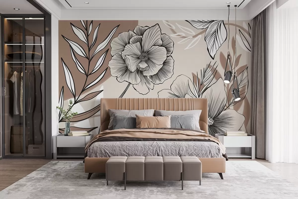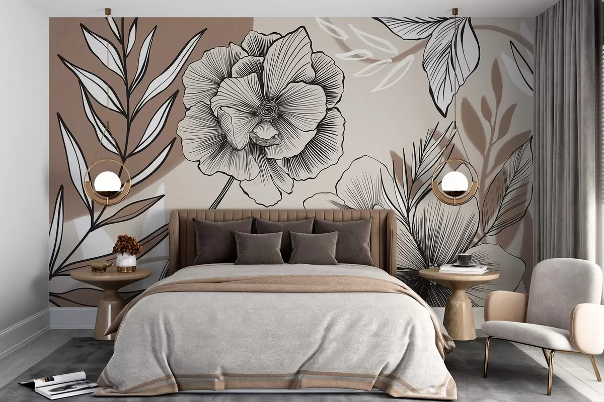 Papier peint photo Grandes fleurs graphiques en noir et blanc avec des feuilles détaillées sur un fond abstrait beige N° w08580