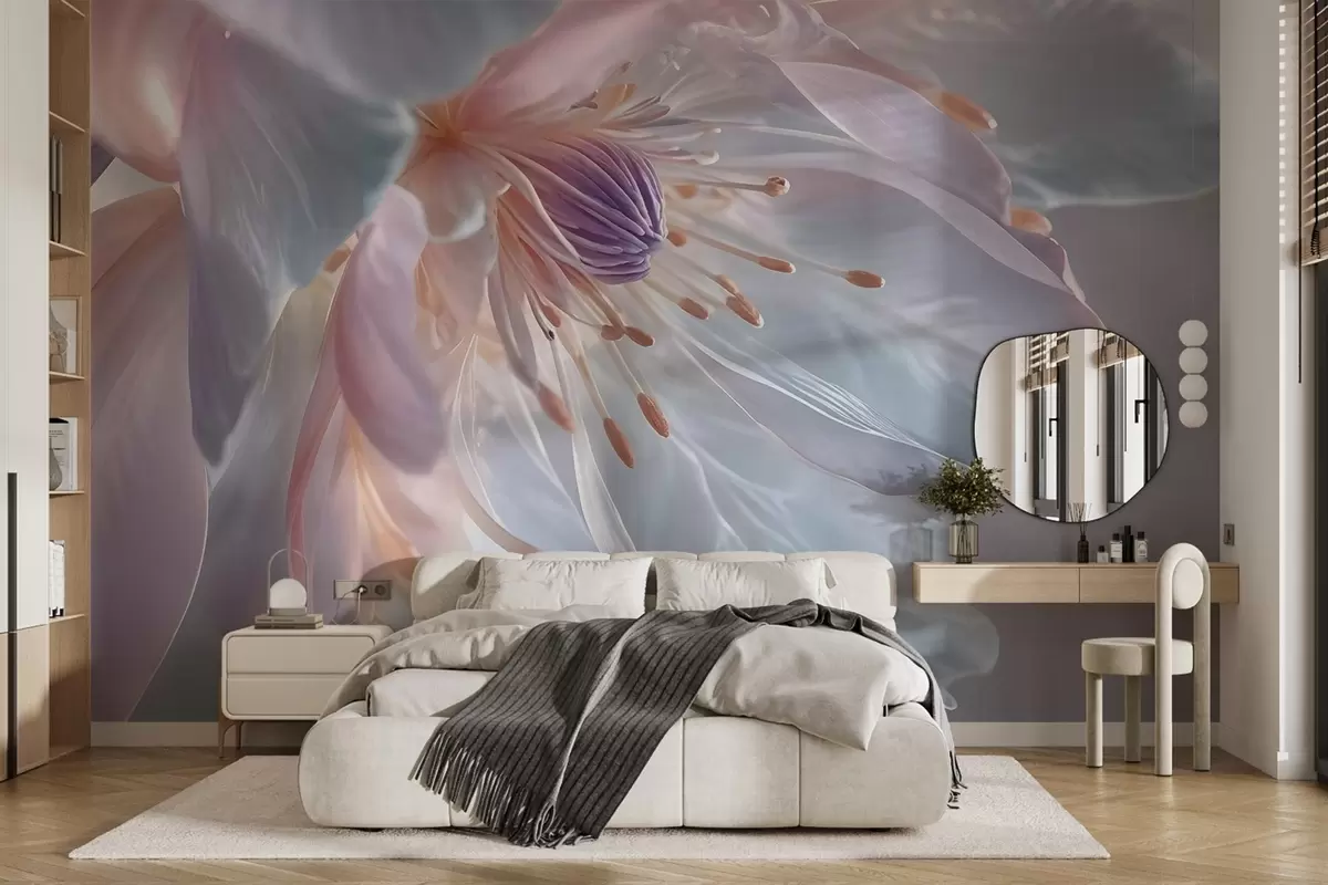 Papier peint photo Gros plan sur une fleur délicate, de couleur pastel, aux pétales doux et translucides et au centre vibrant N° w08605