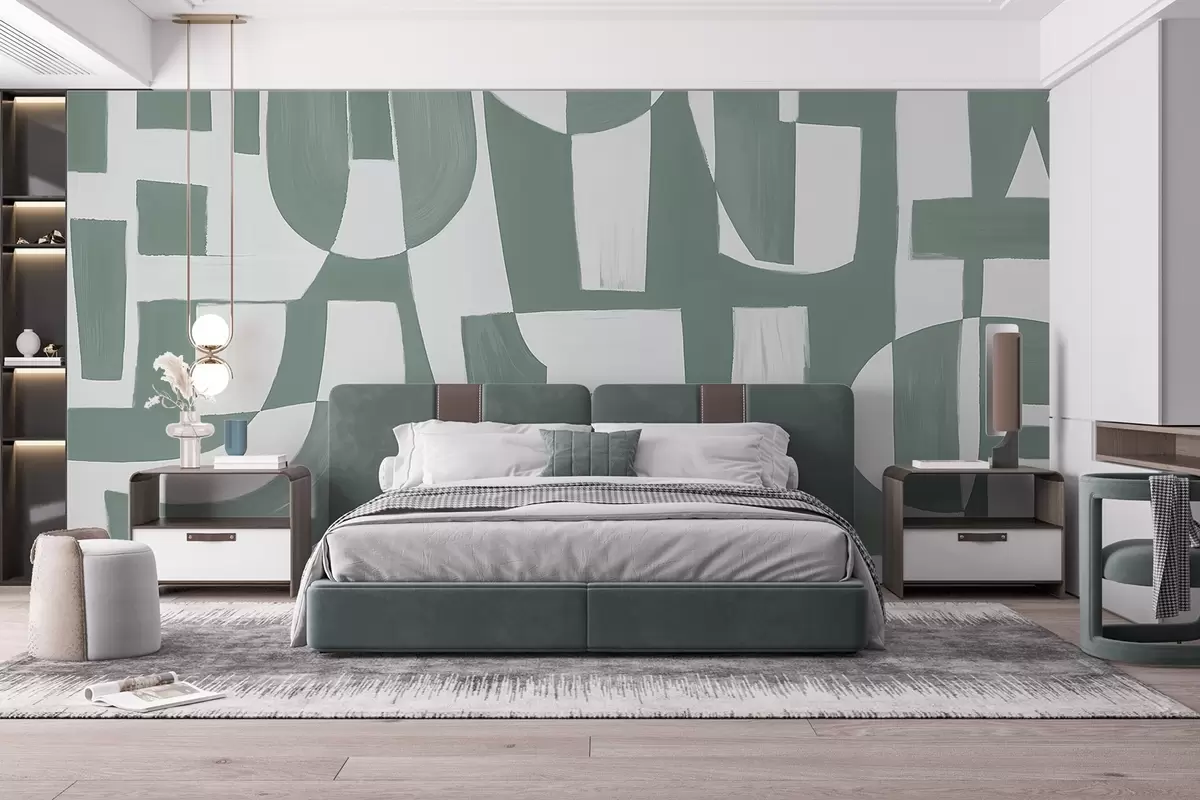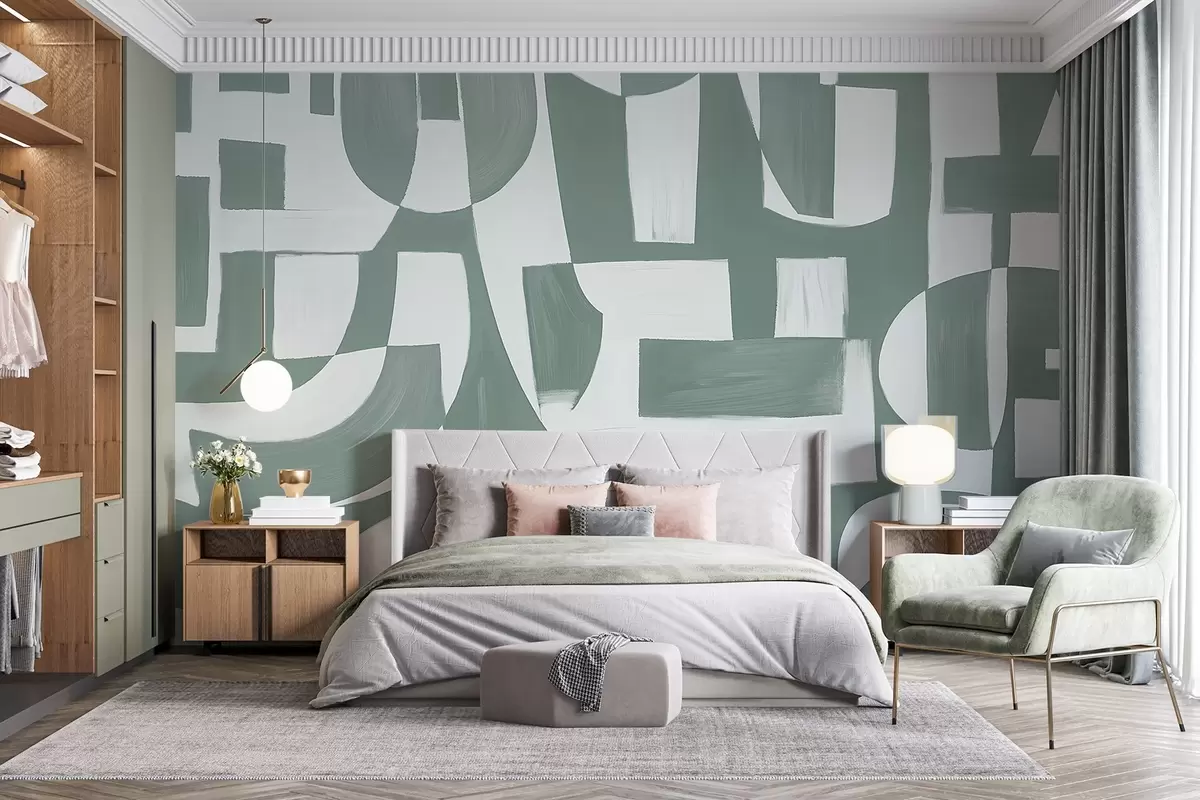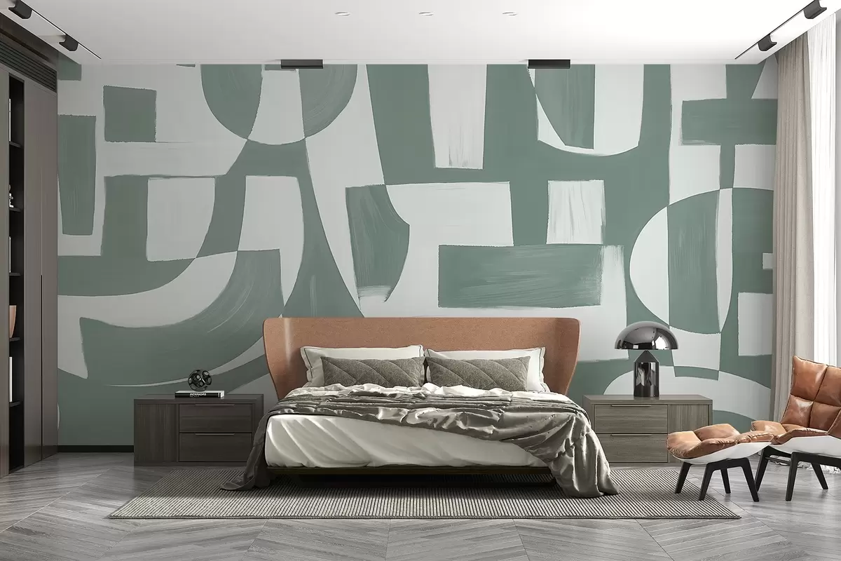Papier peint photo Formes et motifs géométriques abstraits verts et blancs, créant une composition dynamique et visuellement frappante N° w08608v1