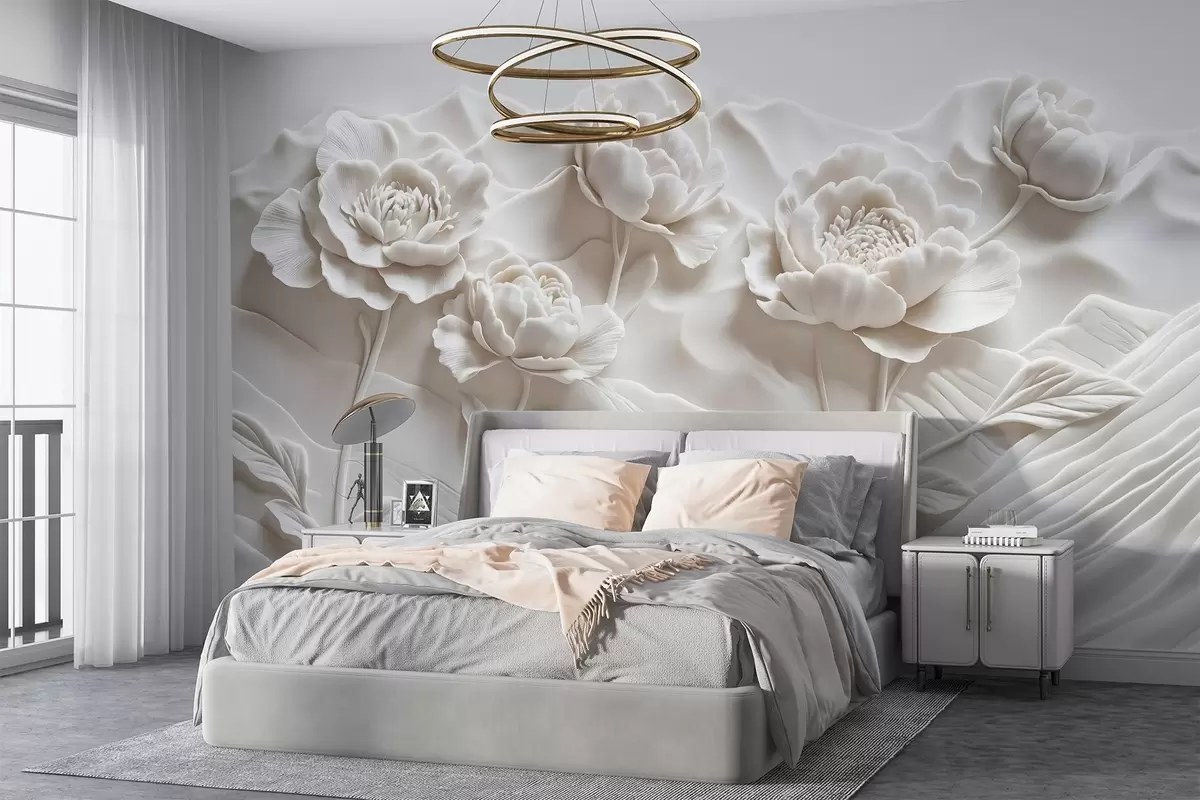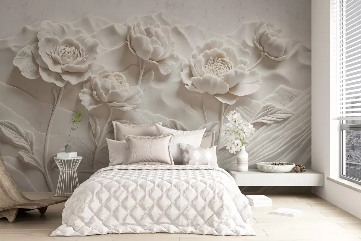 Papier peint photo Une imitation florale blanche de sculpture en relief avec de grandes fleurs de pivoine détaillées sur un fond uni N° w08612