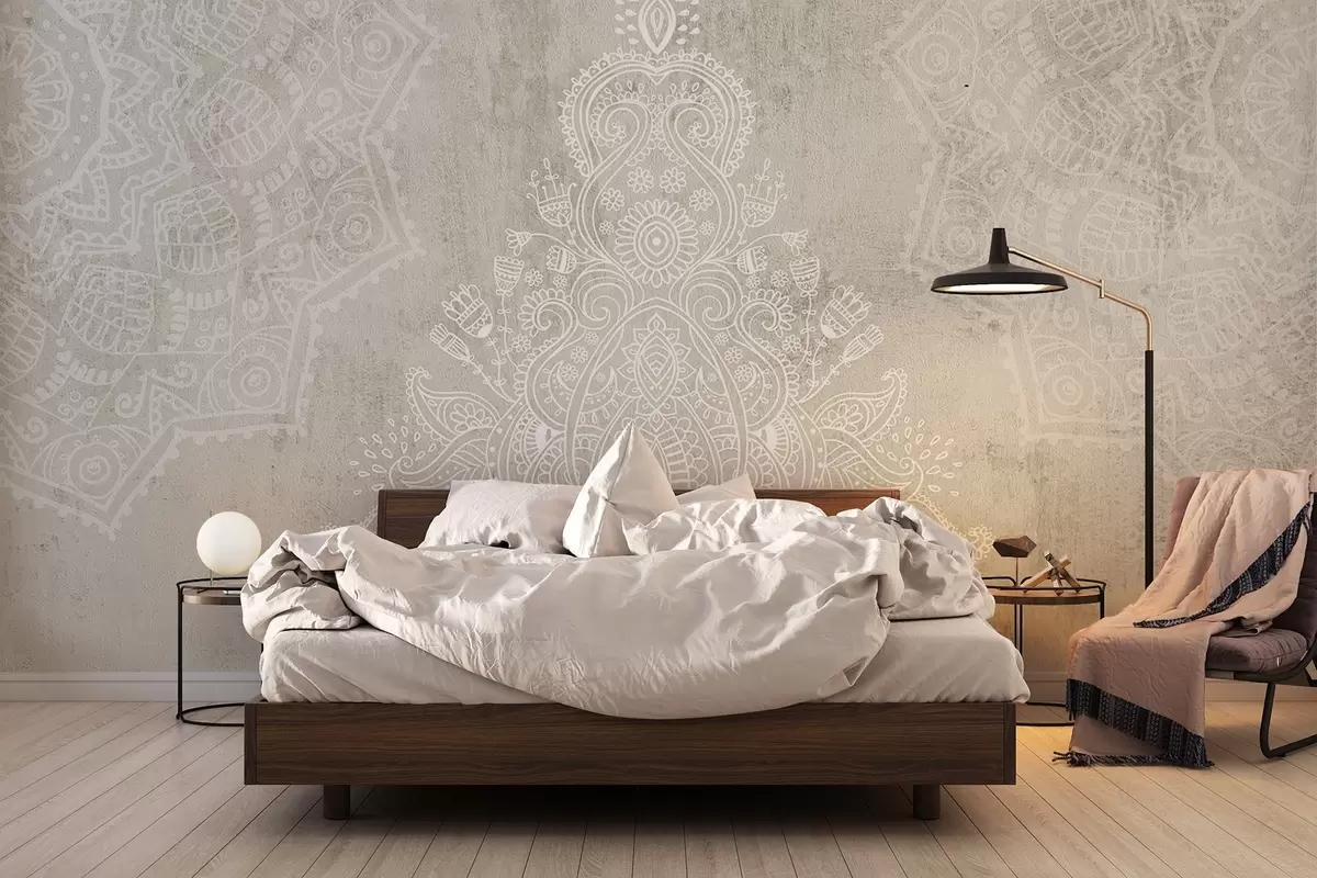 Papier peint photo Un imprimé de mandala en dentelle blanche détaillée et complexe sur un fond abstrait texturé beige clair N° w08614
