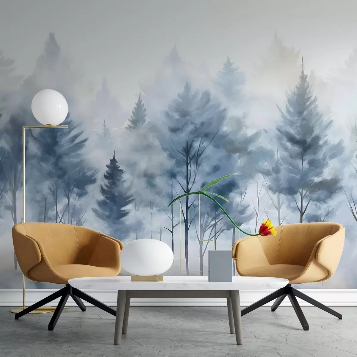 Papier peint photo Paysage forestier brumeux avec de grands pins et des arbres à feuilles caduques au premier plan aquarelle imitation art N° w08643
