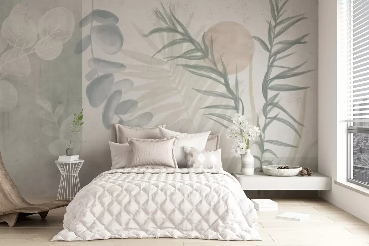 Papier peint photo Un imprimé abstrait minimaliste avec des feuilles stylisées et des eucaliptus aux formes organiques douces et bleues dans des couleurs pastel atténuées N° w08648v1